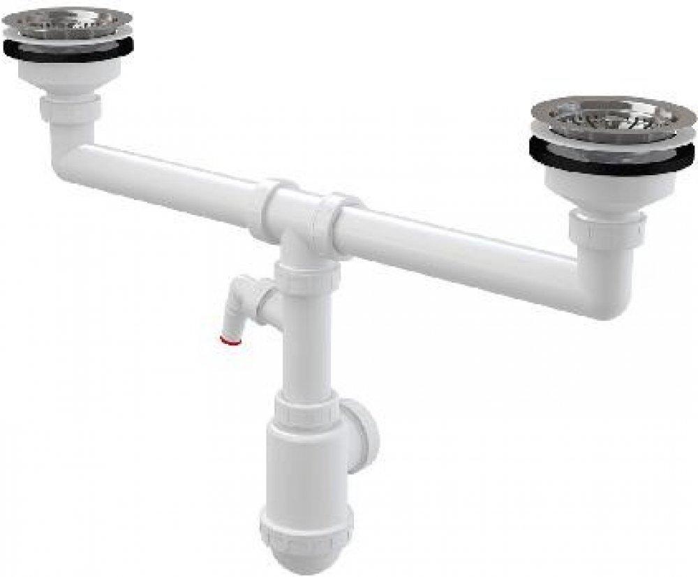 obsah balení: tělo sifonu s dvěma výpustmi a přípojkou, nerezová zátka 2 ks, nerezová mřížka výpusti 2 ks