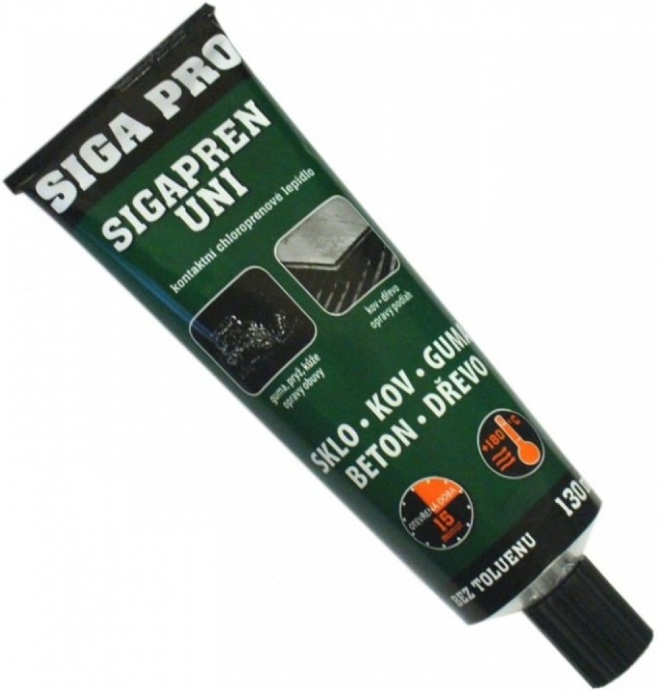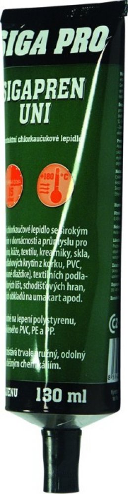 Lepidlo SIGAPREN UNI 130 ml Speciální kontaktní chloroprenové lepidlo se širokým uplatněním v domácnosti a průmyslu. Bez toluenu. Použití: Pro lepení papíru, kůže, textilu, keramiky, skla, kovů, podlahových krytin z korku, keramiky, PVC, gumy (lisované dlaždice), textilních podlahovin, soklových lišt, schodišťových hran, keramických obkladů na umakart apod. Není vhodné na lepení polystyrenu, měkčeného PVC, PE a PP. Vzniklý spoj zůstává trvale pružný, odolný vodě a běžným chemikáliím.