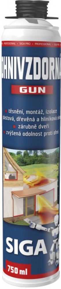 SIGA PRO MONTÁŽNÍ PĚNA OHNIVZDORNÁ PISTOLOVÁ je samozhášivá jednosložková polyuretanová pěna, která tvrdne v kontaktu se vzdušnou vlhkostí. Je určena na těsnění, izolování, montování, lepení a sestavování stavebních prvků (dveře, okna, instalace), při výrobě člunů, přívěsů a pod. Má zvýšenou odolnost proti ohni, B1 (DIN 4102, část 1). Má vynikající zvukové a tepelné izolační vlastnosti.