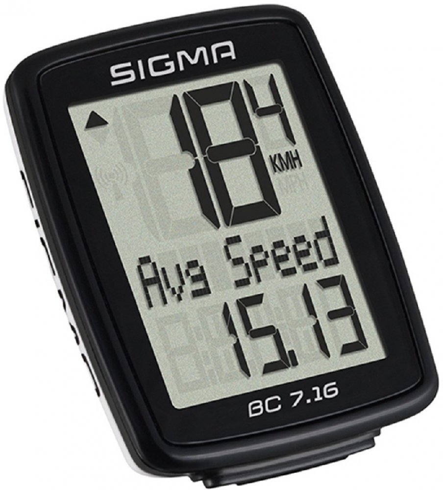 Sigma BC 7.16 v drátové verzi Funkce: aktuální rychlost denní trasa doba jízdy celkové kilometry celková doba jízdy čas 12h/24h průměrná rychlost scan-mode nastavení pomocí rozměrů pneumatikDistributor: Cyklomax, spol. s r.o., Pardubická 504, 533 52 Srch. E-mail: info@cyklomax.cz
