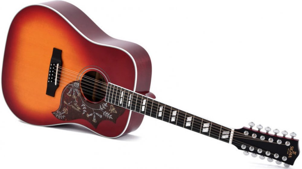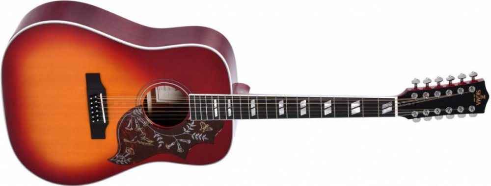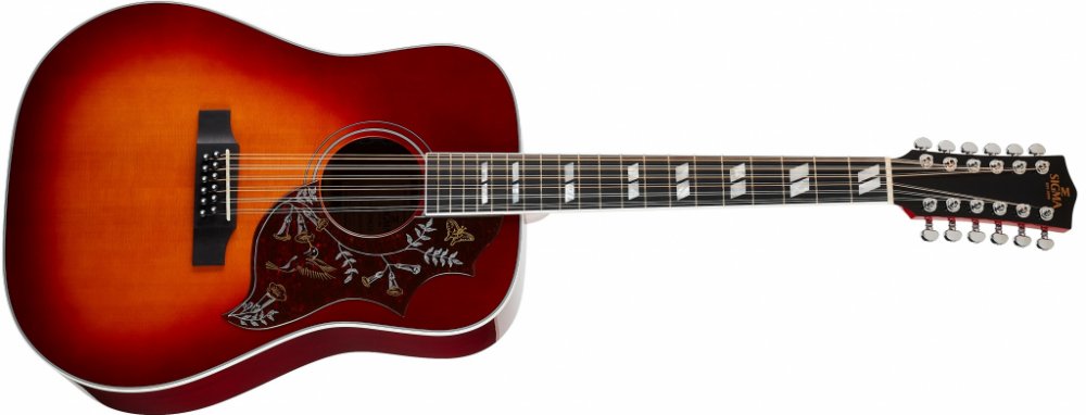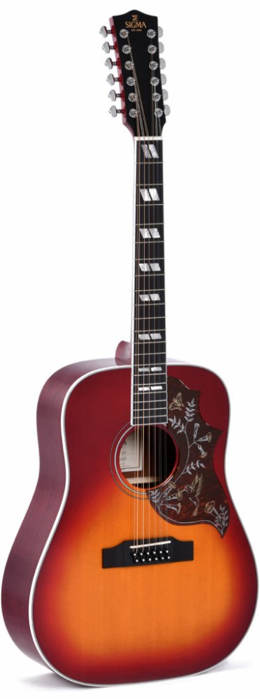 Model Sigma Guitars DM12-SG5 je novinkou značky pro rok 2020 a je dvanáctistrunnou variantou úspěšného modelu DM-SG5. Stejně jako DM-SG5, přináší tato kráska čistý a jasný závan klasického vzhledu a zdobnosti ve stylu legendárního Gibson Hummingbird. V případě tohoto překrásného modelu se jedná o jakýsi pomyslný návrat a modernizaci neozvučeného modelu, který Sigma Guitars vyráběla na samém počátku své éry v r. 1970 v Koreji. DM12-SG5 je standardním dreadnoughtem, který využívá potenciál tohoto tvaru těla skutečně naplno a šlape svým americkým vzorům nemilosrdně na paty.Překrásné a velmi vkusné zdobení dělá z tohoto nástroje skutečný skvost, pastvu pro oči i uši.Překrásná povrchová úprava v provedení heritage cherry sunburst je ve stáji Sigma Guitars vyjímečná a dodává nástroji přesně ten správný punc velkého návratu a jedinečnosti zároveň. Lazená žebra, kostěné komponenty a precizní tovární seřízení jsou i u tohoto nástroje značky Sigma Guitars samozřejmostí. Nenápadný a kvalitní snímač Fishman Sonitone funguje skvěle a obohacuje tak možnosti tohoto zdařilého nástroje o další rozměr.Tato jedinečná kytara s vynikajícím poměrem cena versus kvalita si bezpochyby najde své obdivovatele. Popis • model: DM12-SG5 • tvar těla: Square-Shoulder Dreadnought , 14-fret • rezonanční deska: masivní smrk sitka • zadní deska a luby: mahagon • krk: mahagon • hmatník a kobylka: micarta • orientační značky: • mechanika: chrom, mini diecast • rozeta: bílé a černé kružnice • lemování: bílé • menzura: 628 mm • nultý pražec: kost 47,6mm • kobylkové sedlo: kost s kompenzací • povrchová úprava: mat • barva: heritage cherry sunburst • snímač: Fishman SonitoneO značce Sigma Guitars: