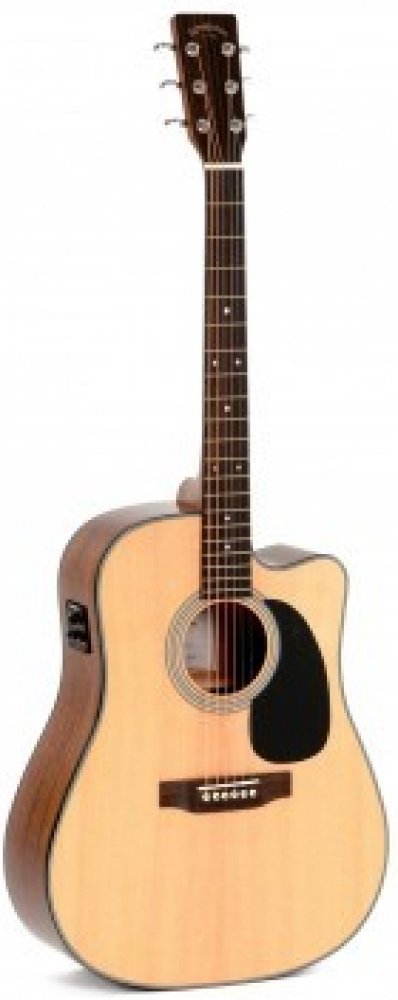 Elektroakustická kytara Akustické kytary Sigma nabízí tradiční vzhled i zvuk modelů proslulé americké značky, ovšem za mnohem příznivější cenu. Sháníte-li tradiční akustický nástroj, jistě si tyto kytary při výběru nenechte ujít. Model této kytary disponuje tvarem těla Dreadnought; ne nadarmo je jeho název odvozen od bojové lodě – tyto kytary nabízí zvuk, který se nikde neztratí a prorazí si cestu za každých okolností. Přední deska této kytary je vyrobena z masivního smrku Sitka, luby a zadní deska jsou z mahagonu. K mahagonovému krku, standardně připojenému k tělu na čtrnáctém pražci, je přilepen hmatník z kompozitního materiálu micarta osazený dvaceti pražci. Menzura kytary je 645 mm, šířka nultého pražce odpovídá rozměru 43 mm. Sedlo je stejně jako nultý pražec zhotoveno z kosti. K ladění slouží chromované die-cast ladící mechaniky, před údery trsátkem chrání lak černý pickguard. Okolo ozvučnice je ozdobná rozeta. Kytara je vybavena podkobylkovým piezo snímačem s aktivní elektronikou firmy Fishman se zabudovanou ladičkou a dvoupásmovým ekvalizérem. Použité materiály a příjemný feel dělají z této kytary velmi zajímavý nástroj, který jistě ocení řada hráčů. Neváhejte a přijďte ho vyzkoušet.