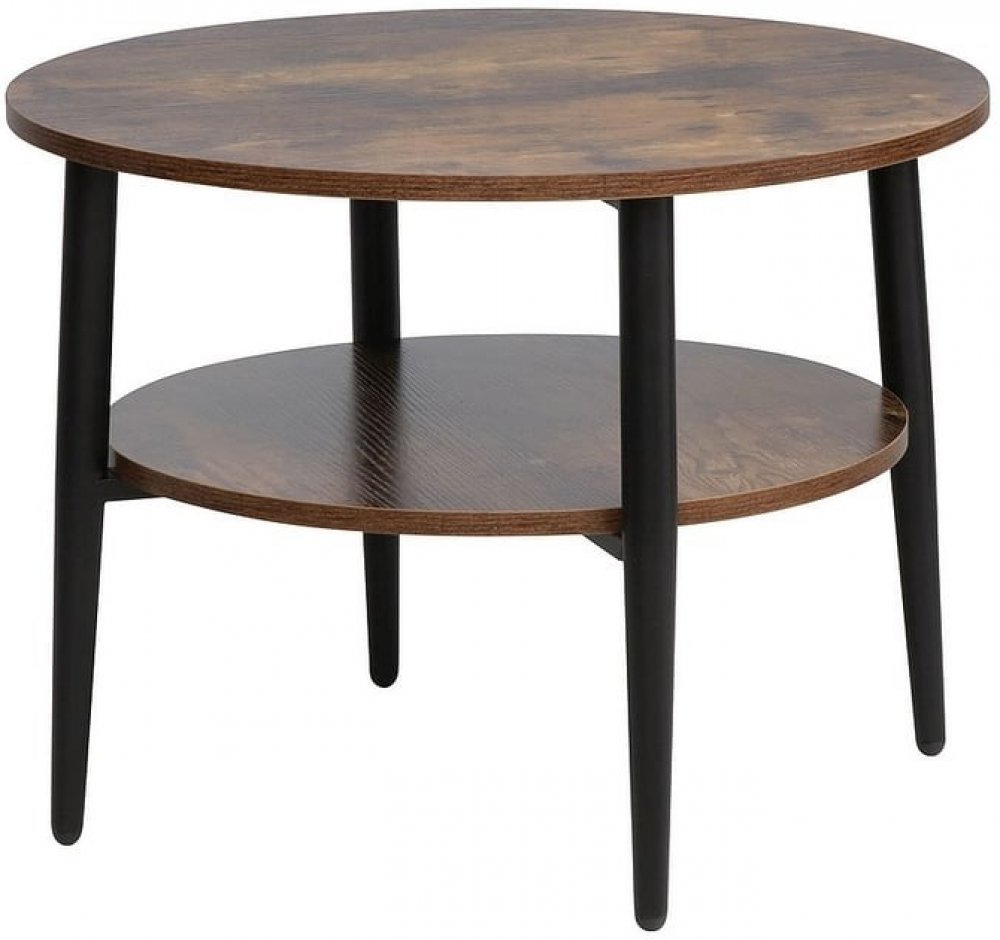 Konferenční stolek Ella IIJednoduchý a nadčasový – tak bychom mohli shrnout design stolku Ella II. Jeho vzdušnou konstrukci bez zbytečných výstřelků oceníte doma, v kanceláři i v kavárně.Svým kruhovým tvarem se hodí např. k rohové sedačce nebo mezi několik pohodlných křesel.Deska i prostorná police jsou z laminované dřevotřísky v tmavě hnědém dezénu dřeva. Ten má úmyslně zašlý, takřka rustikální vzhled. Podnož je pak z černých kovových trubek.Stolek má průměr 60 cm a výšku 45 cm.Konferenční stolek Ella II