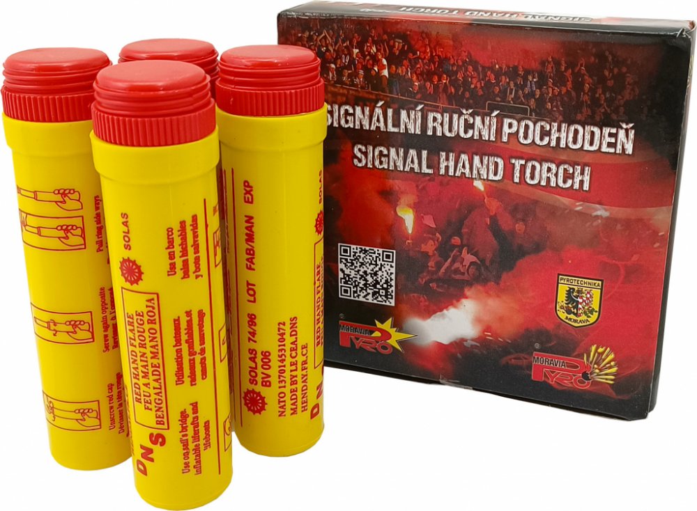 Pyrotechnika Signální Pochodeň červená 4ksVětruvzdorná čerená signální pochodeň - hoří 60 sekund.Celková délka: 265mmBalení v kartonu: 30/4Třída nebezpečí: Kategorie P1ADR zařazení: 1.4GBezpečnostní pokyny: Pouze pro venkovní použití. Nevdechovat kouř. Držte v natažené ruce a směřujte od těla a od ostatních lidí.Vždy postupujte dle návodu na obalu.