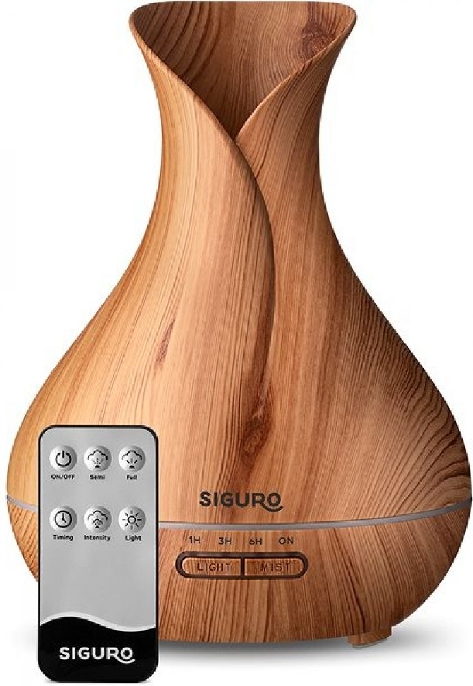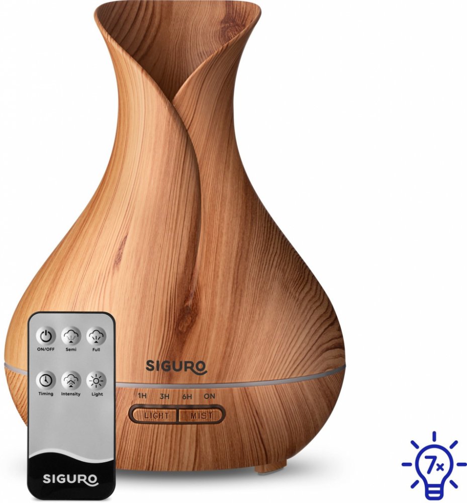 Aroma difuzér Siguro AD-G40 Light WoodNádherně si provoňte místnost, zlepšete náladu, zvlhčete vzduch a vytvořte útulnou atmosféru. To vše zvládnete pomocí jediného přístroje – aroma difuzéru Siguro AD-G40 Light Wood v nádherné imitaci dřeva, který perfektně doplní jakýkoliv interiér. Přístroj lze používat v kombinaci s přírodními esenciálními oleji nebo samostatně s vodou jako zvlhčovač vzduchu a je vhodný pro místnosti o velikosti 20–40 m2. Jistě oceníte i velmi tichý až neslyšitelný chod, díky čemuž vás nebude rušit při relaxování.Pohodlná obsluha tlačítky nebo dálkovým ovladačemPoužití aroma difuzéru Siguro AD-G40 Light Wood je velmi snadné, stačí naplnit nádržku o objemu 400 ml vodou s esenciálním olejem a přístroj zapojit do elektrické sítě. Ovládání zajišťují dvě tlačítka. Pomocí tlačítka MIST nastavíte intenzitu a režim vypouštění páry – nepřetržitý chod či automatické vypnutí po jedné, třech nebo šesti hodinách. Tlačítko LIGHT poté slouží pro ovládání podsvícení, které je k dispozici...