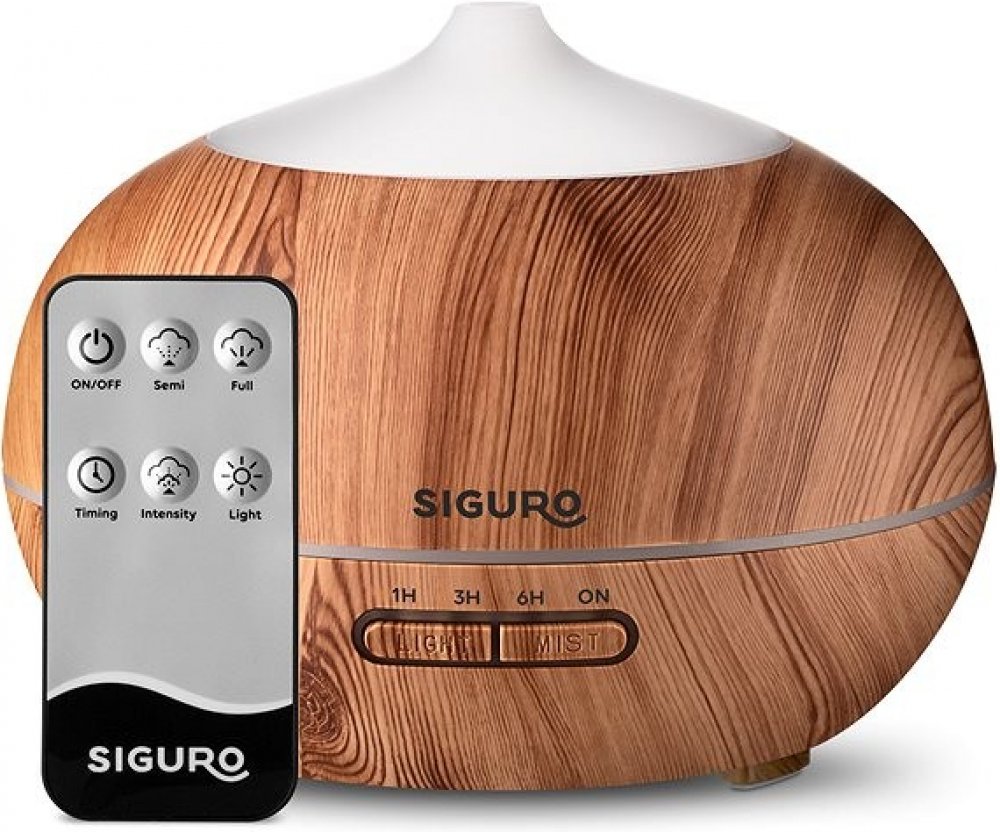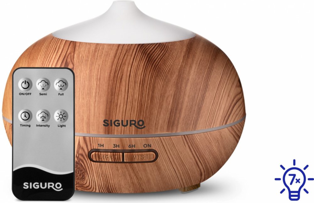 Aroma difuzér Siguro AD-G42 Light WoodNádherně si provoňte místnost, zlepšete náladu, zvlhčete vzduch a vytvořte útulnou atmosféru. To vše zvládnete pomocí jediného přístroje – aroma difuzéru Siguro AD-G42 Light Wood v nádherné imitaci dřeva, který perfektně doplní jakýkoliv interiér. Přístroj lze používat v kombinaci s přírodními esenciálními oleji nebo samostatně s vodou jako zvlhčovač vzduchu a je vhodný pro místnosti o velikosti 20–40 m2. Jistě oceníte i velmi tichý až neslyšitelný chod, díky čemuž vás nebude rušit při relaxování.Pohodlná obsluha tlačítky nebo dálkovým ovladačemPoužití aroma difuzéru Siguro AD-G42 Light Wood je velmi snadné, stačí naplnit nádržku o objemu 400 ml vodou s esenciálním olejem a přístroj zapojit do elektrické sítě. Ovládání zajišťují dvě tlačítka. Pomocí tlačítka MIST nastavíte intenzitu a režim vypouštění páry – nepřetržitý chod či automatické vypnutí po jedné, třech nebo šesti hodinách. Tlačítko LIGHT poté slouží pro ovládání podsvícení,...