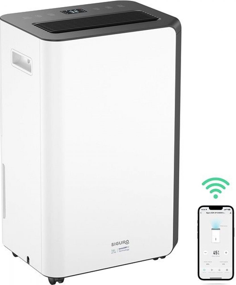 velikost místnosti až 60 m2, objem nádoby 4,5 l, odvlhčovací kapacita 16 l/den, čištění vzduchu ionizací, 1× filtr aktivní uhlík, 1× nylonový omyvatelný filtr, časovač vypnutí a zapnutí, digitální ukazatel vlhkosti vzduchu, nastavení požadované vlhkosti, dotyková tlačítka, displej, dětský zámek, WiFi, TUYA Smart aplikace, hlučnost