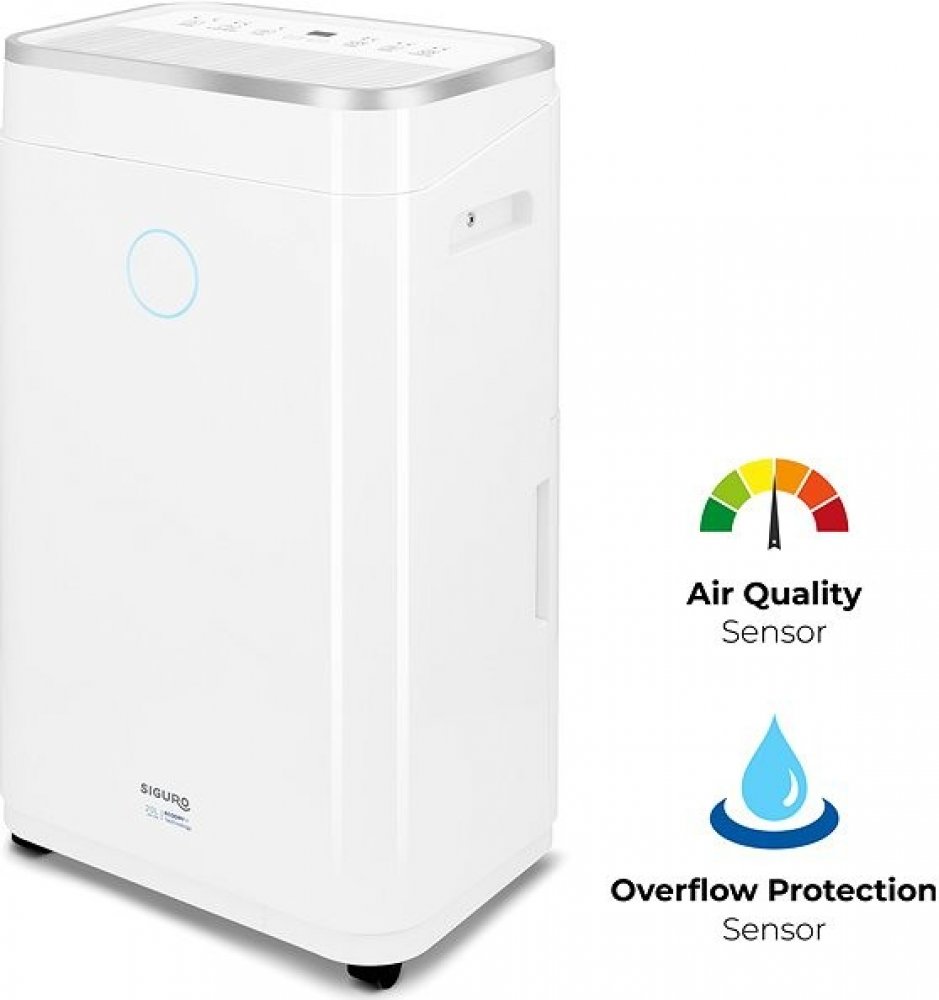 Odvlhčovač vzduchu Siguro DH-P30 OrcaRelativní vlhkost vzduchu by se v domácnosti dle odborníků měla pohybovat v rozmezí od 40 do 60 %. Pokud vlhkost dosahuje hodnot vyšších než 60 %, měli byste začít přemýšlet nad pořízením odvlhčovače vzduchu – předejdete tak nejen tvorbě plísní, ale i dýchacím a dalším zdravotním problémům. Siguro DH-P30 Orca je odvlhčovač, který vás efektivně zbaví nadměrné vlhkosti a vytvoří zdravé prostředí. Tento přístroj s maximální hlučností 45 dB je ideální pro použití v místnostech o velikosti do 25 m2 a jeho odvlhčovací kapacita činí 20 litrů za den.Možnost připojení k odpaduOdvlhčovač vzduchu Siguro DH-P30 Orca je vybavený 6,5litrovou nádobou na kondenzát s praktickým madlem a ukazatelem hladiny, díky čemuž velmi snadno poznáte, kolik vody se v zásobníku nachází. Navíc při jeho naplnění dojde k automatickému vypnutí odvlhčování. Velkou výhodou je možnost připojení odvlhčovače přímo do odpadu (vany, umyvadla apod.) pomocí hadice o délce 1 metr – není tak nutné vylívat vodu...