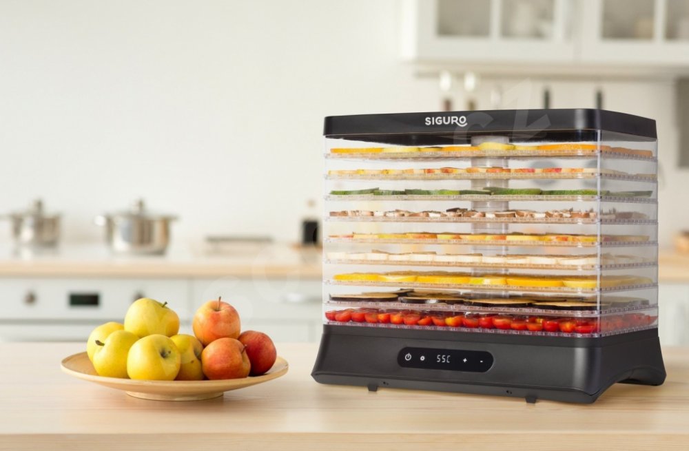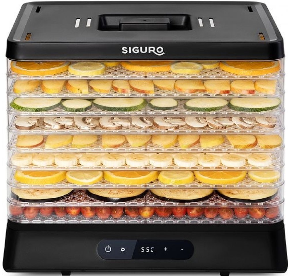 příkon 500 W, kapacita sušení 1 kg, součástí 9 plat vhodných do myčky, digitální ovládání, nastavitelný termostat 35 - 70 °C, časovač, automatické vypnutí, zvuková signalizace, hlučnost 50 dB, rozměry 345 × 305 × 400 mm, rozměr plat sušičky 39 × 26,5 cm, délka kabelu 1 m, 3 roky záruka (SGR-FD-G500B)