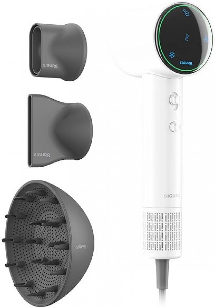 příkon 1 500 W, vysokorychlostní, ionizátor, 4 teplotní stupně, 3 rychlosti proudění vzduchu, režimy střídání teplot a Baby Care, digitální displej, nástavce koncentrátor, stylingová hlavice a difuzér, odnímatelný magnetický filtr, magnetický držák na zeď, délka kabelu 1,7 m (SGR-HR-I550W)