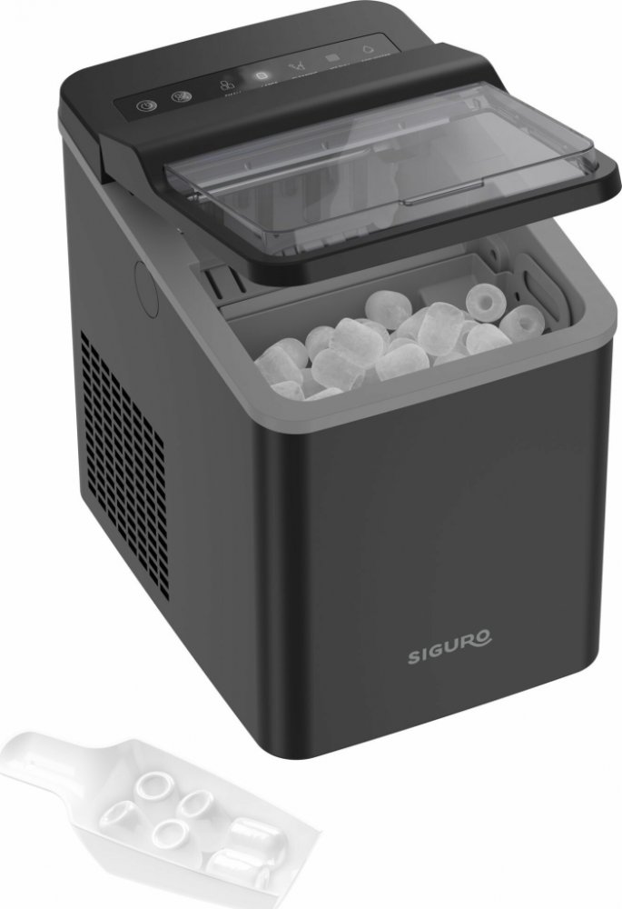 Výrobník ledu Siguro IM-D420B Ice Gem Black&GreyS výrobníkem ledu Siguro IM-D420B Ice Gem zvládnete vyrobit kostky ledu pouhým stiskem tlačítka. Přístroj totiž nevyžaduje žádné složité nastavování – stačí naplnit vodou, vybrat velikost kostek a spustit výrobu. Již za 8 minut budete mít vyrobených prvních 8 kostek. Přístroj za 24 hodin zvládne vyrobit až 10 kg ledu ve dvou různých velikostech. Díky své výkonnosti se skvěle uplatní nejen v domácnosti, ale také například v menší kanceláři. V neposlední řadě zaujme elegantním černým provedením, které perfektně doplní jakýkoliv moderní interiér.Rychlá výroba leduEnergeticky nenáročný výrobník ledu Siguro IM-D420B Ice Gem zvládne vyrobit první dávku ledu, což je 8 kostek ve tvaru "bullet" (kužel), již za 8 minut. Za celý den poté zvládne přístroj vyprodukovat až 10 kg ledu. To vše bez vodovodní přípojky, vodu stačí nalít přímo do přístroje, respektive nádoby o objemu 1,1 litru.Dvě velikosti leduKostky mohou být velké 18 × 30 nebo 22 × 33 mm.Led do 8...