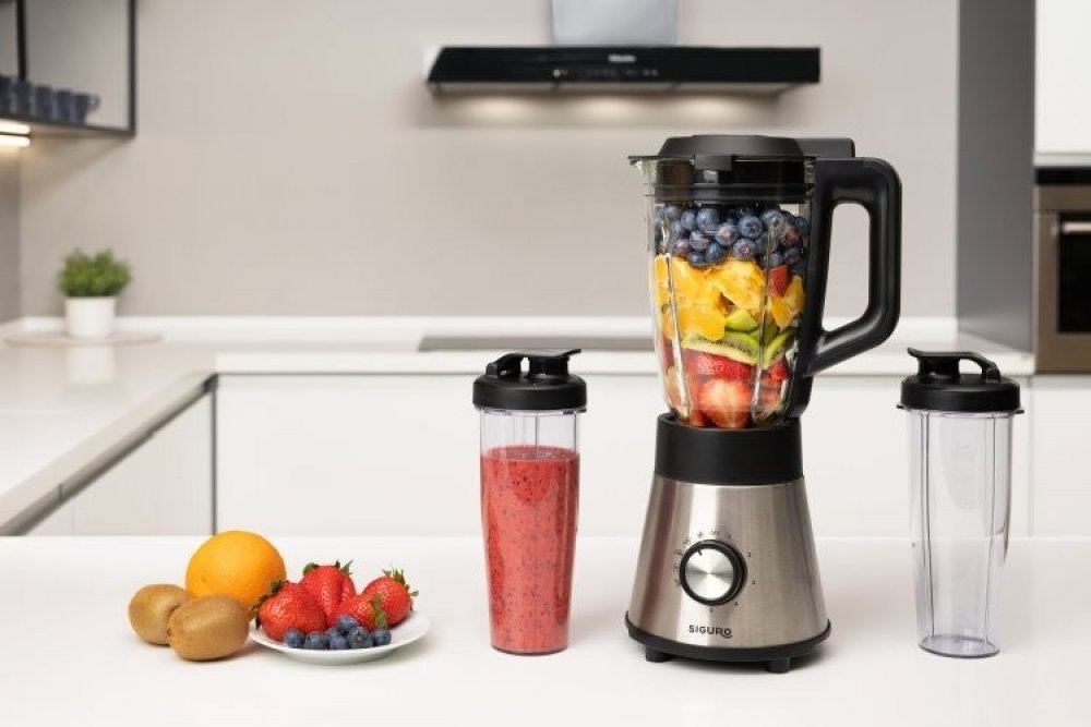 Stolný mixér – príkon 1000 W, maximálne otáčky 20000 ot./min, 5 rýchlostí, prednastavené programy, vhodný na drvenie suchých plodov, smoothie, pyré, drvenie ľadu, príkrmy a drvenie ľadu s pridaním tekutiny, prenosná fľaša, sekáčik a sklenená nádoba súčasťou, 4 nádoby v balení, objem mixovacej nádoby 1,5 l, materiál nádoby sklo
