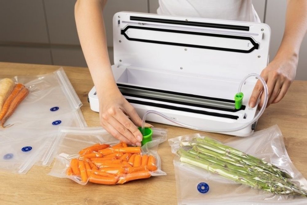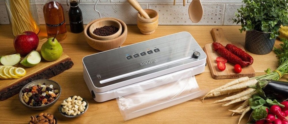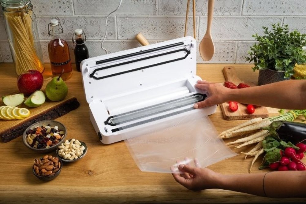 Vakuovačka - sací výkon 5 l/min, integrovaná řezačka, přihrádka na fólie, režimy na suché i vlhké potraviny, funkce sváření, odsávání vzduchu z externí nádoby, ovládací panel s digitálními tlačítky, LED kontrolky, příkon 120 W, kompatibilní s fóliemi o tloušťce 0,073–0,27 mm, sada hadiček pro externí vakuování a role fólií v balení, 92 × 166 × 407mm, 3 roky záruka