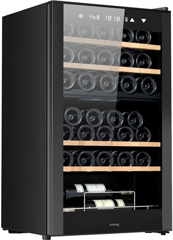 Vnitřní prostor o celkovém objemu 88 litrů je přehledně rozdělený pomocí pěti polic, z nichž jsou čtyři nerezové s čelními panely ze dřeva, které stejně jako prosklené dveře perfektně doplňují atraktivní design vinotéky. Dřevo navíc pomáhá udržovat ideální vlhkost. Do vinotéky Siguro WC-G331B Dual Wine můžete uložit láhve s maximální výškou 33 cm. Samozřejmostí je vnitřní LED osvětlení pro dokonalé nasvícení vnitřního prostoru. Osvětlení jednoduše aktivujete tlačítkem, tudíž není potřeba otevírat dveře a po 10 minutách automaticky zhasne. LED technologie je nejen úsporná, ale nevydává vůbec žádné teplo, díky čemuž nedochází ke zvyšování teploty uvnitř vinotéky.