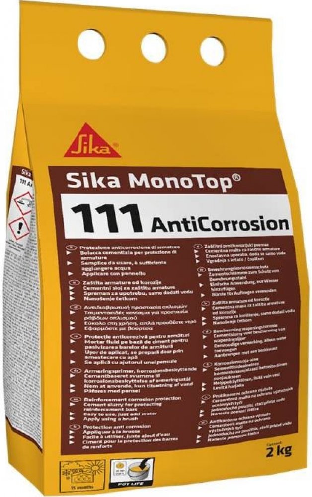 jednosložkové cementové pojivo, zušlechtěné umělými hmotami, zesílené umělými vlákny, na ochranu výztuže proti korozi a sanaci betonů, spotřeba ~1,5–2 kg/m2/mm, 2 kg/bal.