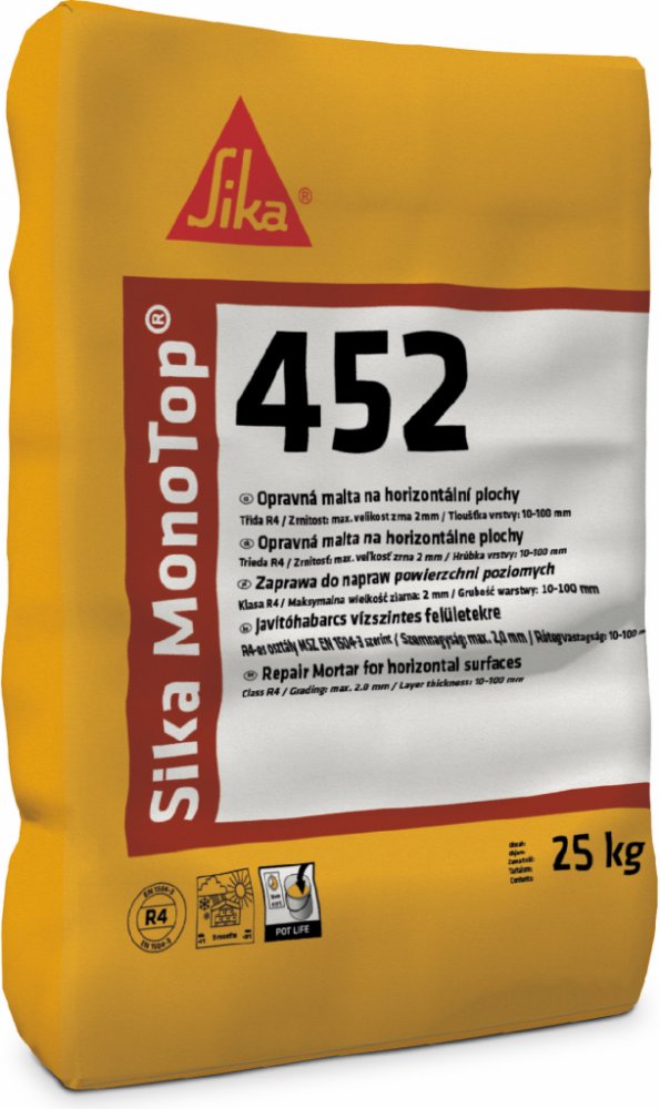 Sika MonoTop®-452 je 1-komponentní cementová opravná malta, zesílená umělými vlákny, na bázi technologie Silicafume. Splňuje požadavky třídy R4 dle normy EN 1504-3. Díky redukovanému smrštění je vhodná pro vrstvy s větší tloušťkou a horizontální celoplošné opravy.