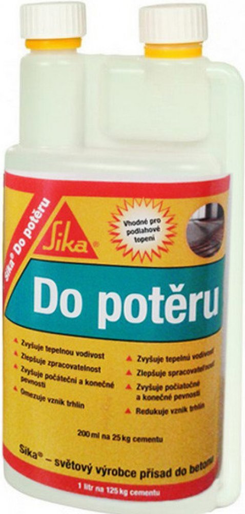Sika Do potěru je vysoce účinná přísada, která ulehčuje zpracování potěrové malty a současně urychluje tvrdnutí. Zvyšuje pevnost v tlaku a pevnost v tahu za ohybu. Zvyšuje tepelnou vodivost potěrů s podlahovým vytápěním. Výhody: neovlivňuje životnost trubek z umělé hmoty pro podlahové vytápění nezavádí do potěrové malty žádný dodatečný vzduch neobsahuje chloridy zvyšuje tepelnou vodivost zlepšuje zpracovatelnost zvyšuje počáteční i konečné pevnosti omezuje vznik trhlin urychluje tvrdnutí potěru