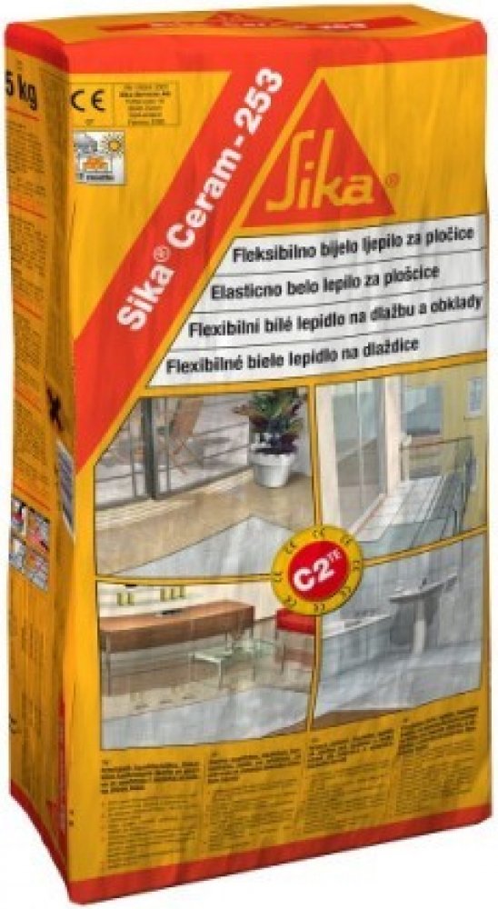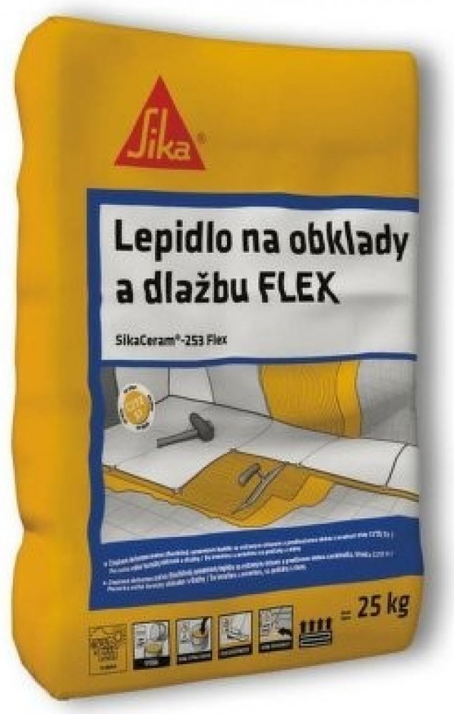 SikaCeram-253 Flex je zlepšené cementové lepidlo se sníženým skluzem a prodlouženou dobou zavadnutí, flexibilní s klasifikací C2TES1. Použití: keramická dlažba, lisovaná, tažená a nebo pálená dlažba keramické krytiny, jemně slinuté dlaždice, kameninové dlaždice desky z betonového, umělého a z přírodního kamene (nikoliv citlivých na vodu) dlažby z přírodního a umělého kamene vymývaná dlažba necitlivá na barevné změny na svislé a vodorovné podklady v interiéru i v exteriéru na beton, maltu, sádrokarton, cemento-třískové desky na existující starou dlažbu na anhydritové podklady (s penetrací) na podlahy s podlahovým vytápěním na podlahy, kde můžeme očekávat smršťování nebo teplotní expanzi pro balkóny, terasy a bazény Výhody: flexibilní tixotropní voděodolné a mrazuvzdorné prodloužená doba zavadnutí Spotřeba: cca 1,6 - 3,1 kg/m² v závislosti na typu obkladového materiálu, hrubosti podkladu a na použité zubové stěrce