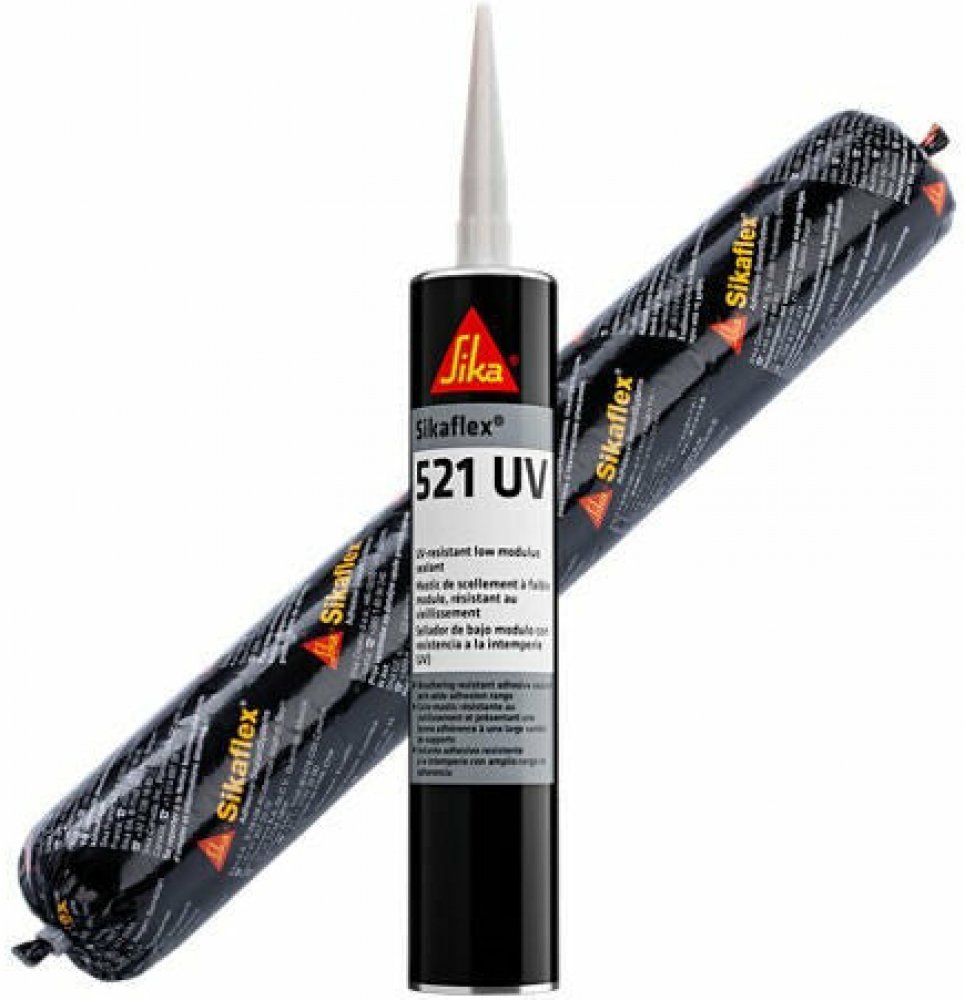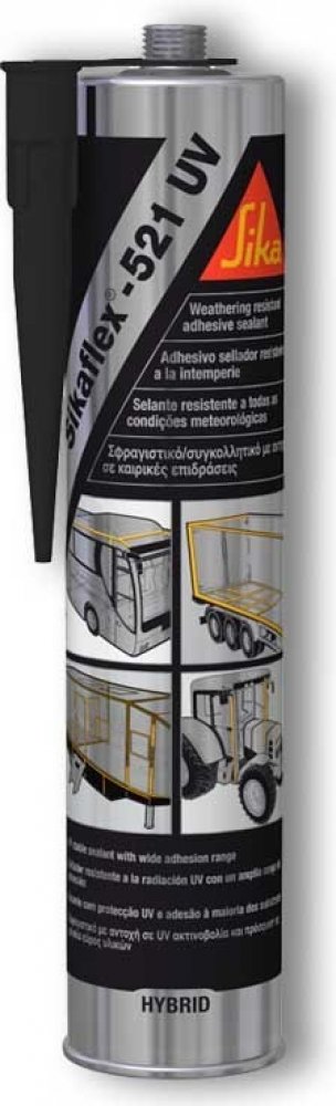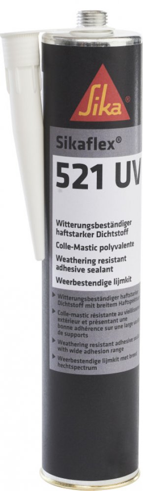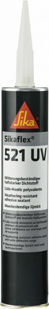 * pružný, vysoce elastický, odolný UV záření a vnějším klimatickým podmínkám, silně přilnavý, jednokomponentní, vzdušnou vlhkostí vytvrzující tmel na bázi polyuretan - hybridu, přelakovatelný, pro pružné utěsnění náročných vnějších vzhledových spojů vystavených UV záření a ostatní vnějším vlivům. ➤ POPIS * Sikaflex -521 UV je víceúčelový, nestékavý, pružný 1komponentní těsnící tmel na bázi PUR hybrid, který vytvrzuje reakcí se vzdušnou vlhkostí na trvanlivý elastomer. * Sikaflex -521 UV neobsahuje isokyanáty. Sikaflex -521 UV je vyráběn v souladu s normami kvality ISO 9001 a 14001 a v souladu s programem « Responsible Care ». ➤ PŘEDNOSTI PRODUKTU *1komponentní *odolný UV záření *odolný stárnutí a povětrnosti *dobrá adheze na široké spektrum materiálů bez užití primeru *pružný *přelakovatelný *brousitelný *nízký zápach *nevyvolává korozi *vyšší elektrický odpor *bez nebezpečných látek a rozpouštědel *neobsahuje silikon *neobsahuje PVC ➤ OBLAST POUŽITÍ * Sikaflex -521 UV je vhodný pro trvale pružné spoje, zejména exterierové vystavené trvale UV záření a povětrnostním vlivům v kombinaci s útlumem vibrací atd. * Vhodnými podklady jsou kovy, lakované povrchy (zejména 2 k laky), keramické materiály, lamináty a plasty.