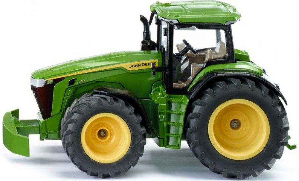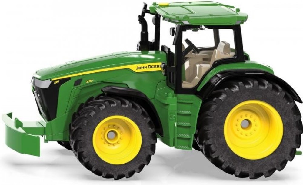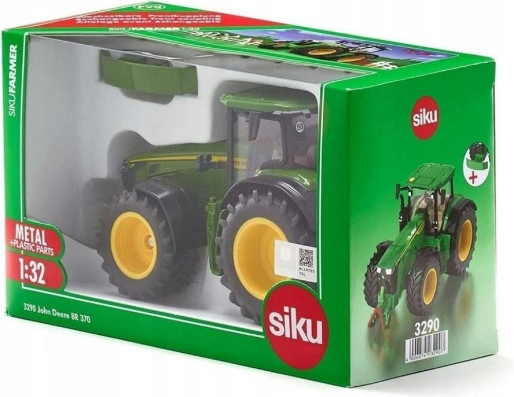 Kovový model traktoru John Deere 8R 370 v měřítku 1:32. Se zatáčením předních kol pomocí volantu, kyvadlovou přední nápravou a otevíracím krytem motoru. Kabinu se sklopnými zrcátky lze oddělat. Přední držák a zadní závěs umožňují použití dalšího příslušenství Siku 1:32. Součástí balení je maketa předního závaží, kterou lze nacvaknout místo předního držáku. Vhodné pro hraní i sběratelství. Kvalitní autentické zpracování z kovu a plastu.