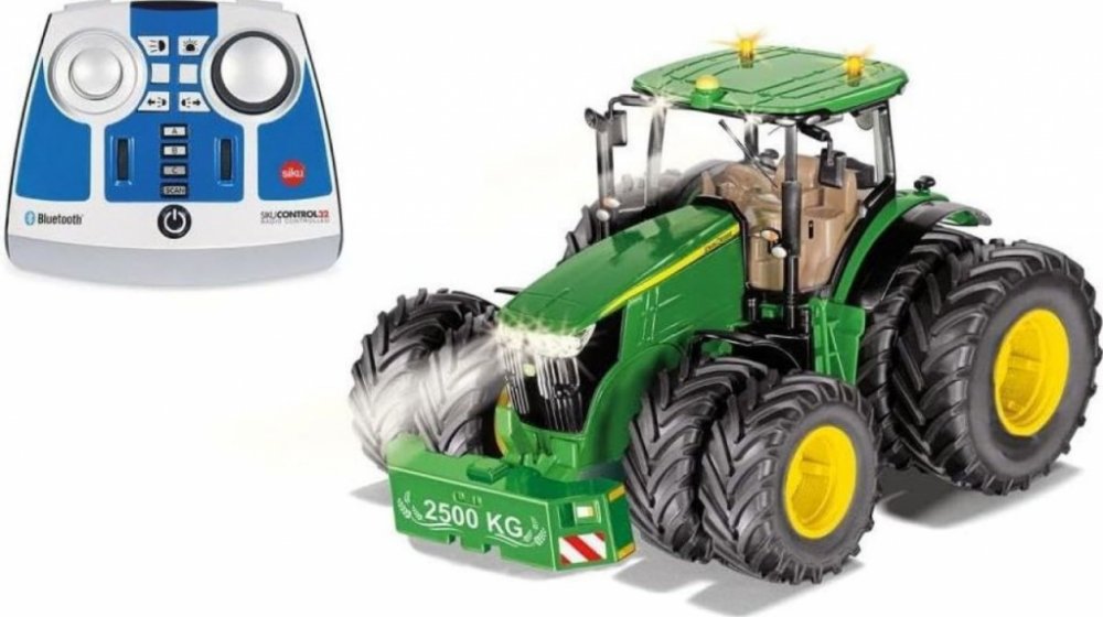 SIKU Control – Bluetooth, John Deere s dvojitými koly. Moderní traktory jsou vybaveny digitální technologií, aby bylo možné obdělávat půdu co nejefektivněji. Nový SIKUCONTROL John Deere 7290R je ovládán pomocí smartphonu nebo tabletu technologií SIKU APP a Bluetooth. John Deere nejnovější řady 7R s dvojitými pneumatiky má impozantní vzhled. Pokud je půda měkká, snižují dvojité pneumatiky tlak na zem. Pneumatiky jsou spojeny magnety, které jsou bezpečně integrovány do ráfků. Pneumatiky mohou být namontovány a vyjmuty velmi rychle a bez nářadí. John Deere 7290R může jezdit na normálních pneumatikách se zdvojenými pneumatikami na přední a zadní nápravě nebo se zdvojenými pneumatikami pouze na zadní nápravě. Traktor je vyrobený z kovu s plastovými díly. Všechny funkce, stejně jako tři rychlostní stupně, jsou ovládány pomocí aplikace. Lze jej ovládat pomocí virtuálního jyisticku nebo pomocí snímačů pohybu a sklonu mobilních zařízení. Stejně jako připojování a odpojování přívěsů lze pomocí aplikace provádět přesné manévrování. Z tohoto důvodu je zadní spojka elektronicky řízena. Pomocí aplikace lze zapínat a vypínat světlomety na kapotě, na kabině, zadní ukazatele a blikající světla. Aplikace SIKU také poskytuje fanouškům traktoru užitečné informace o vozidle John Deere 7290R. Lze také uložit název traktoru. Nastavení a funkce aplikace jsou průběžně aktualizovány. Pomocí funkce OTA (Over-The-Air) aplikace.