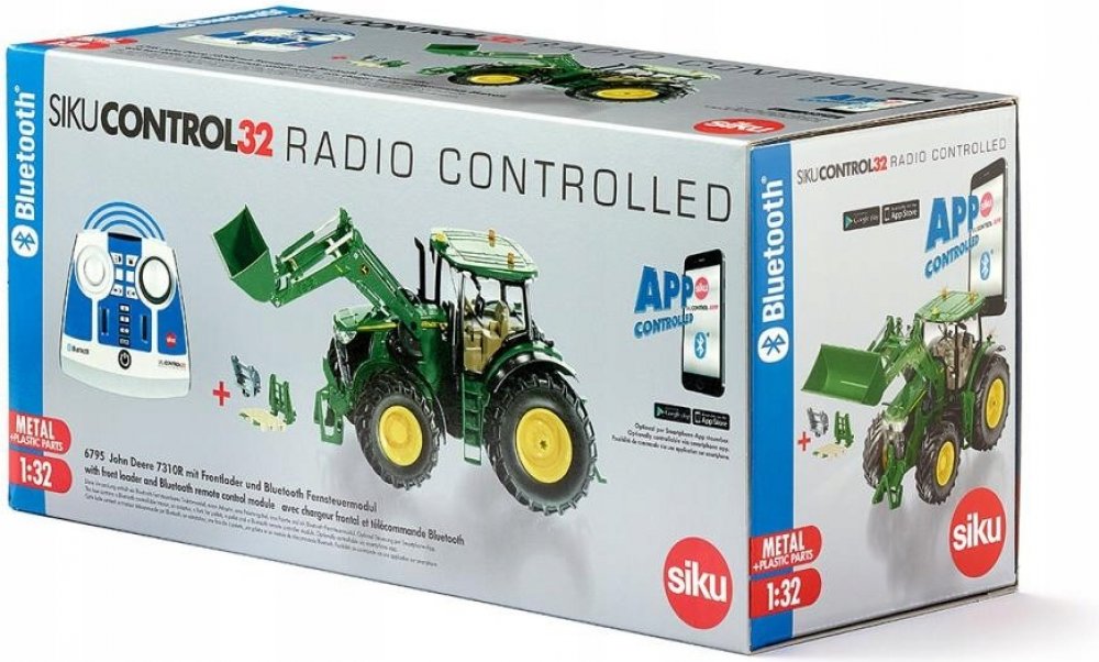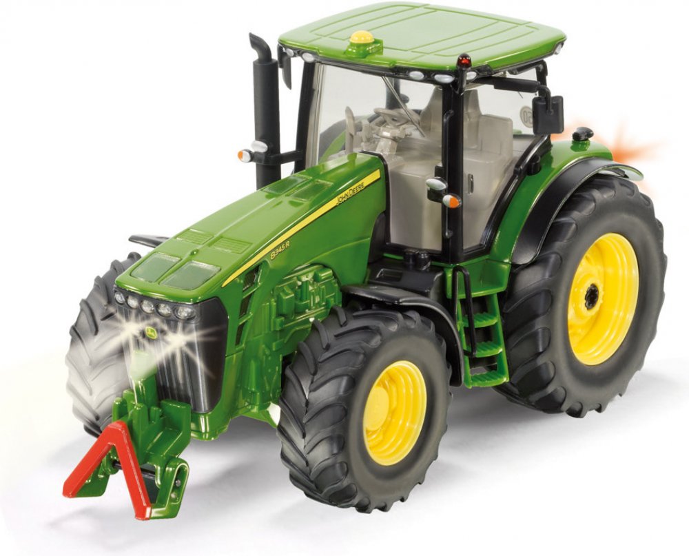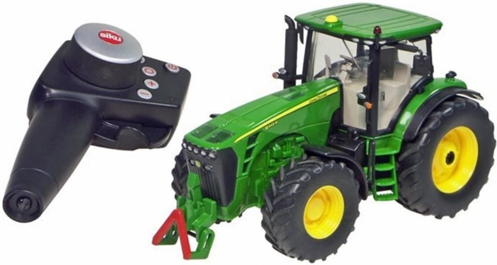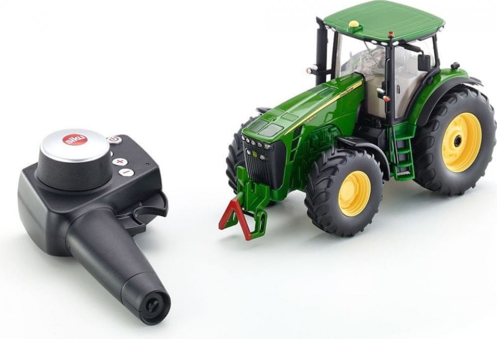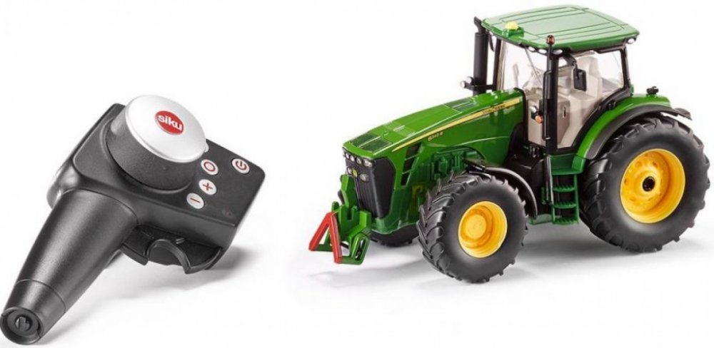 Kvalitní kovový traktor John Deere 8345R s dálkovým ovladačem. Nové a vylepšené ovládání usnadňuje přesné řízení a manévrování. S tímto modelem lze použít spoustu doplňků s řady SIKU Farmer 1:32. Traktor má 2 motory. Stávající rádiové komponenty využívající vlnovou délku 2,4 GHz. Stabilní a vysoce kvalitní traktory vyrobené z tlakově litého kovu a plastu jsou snadno ovladatelné s nově vyvinutým modulem rádiového ovládání. Světlo vpředu a vzadu je během provozu trvale zapnuto. V pohotovostním režimu, tj. Po zapnutí modelu a před připojením k rádiovému řídícímu modulu blikající kontrolka signalizuje, že model je připraven ke spuštění. Model je napájen třemi standardními bateriemi „AAA“. Lze také použít dobíjecí baterie stejného typu. Pokud baterie během provozu klesnou pod určitou úroveň, kontrolka rychle bliká, což značí, že baterie budou brzy vybité. Rádiová řídicí jednotka napájí také dvě stejné baterie. U těchto modelů lze použít všechny přívěsy a spojovací zařízení SIKU Farmer32 pro přední a zadní spojku. Datová zásuvka integrovaná v zadní části traktorů usnadňuje použití modelů příslušenství Control, jako jsou přívěsy, vířivé hrábě a pluhy.