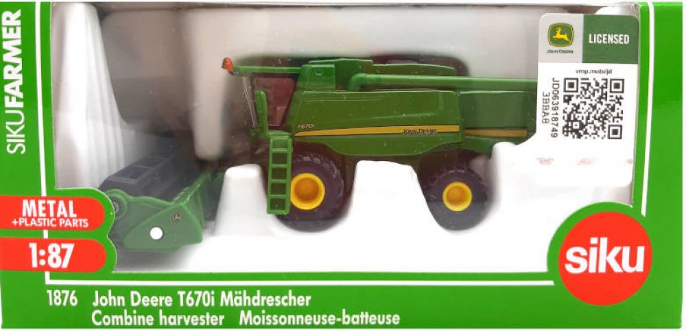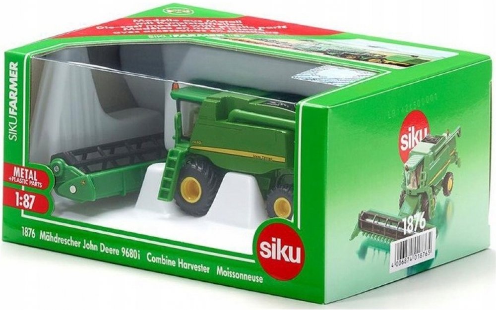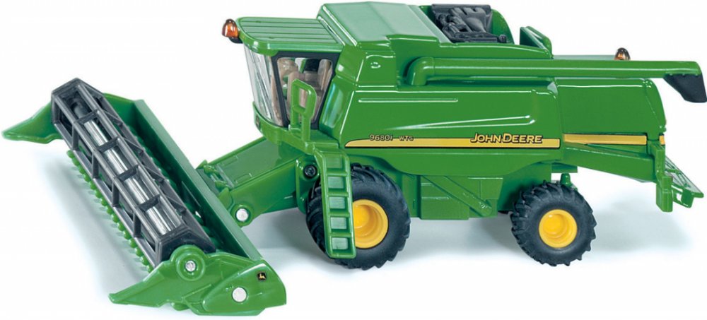 John Deere 9680i je největší kombajn vyráběný v Evropě. Jeho model od firmy SIKU v měřítku 1:87 je téměř celý z kovu. Je vybaven otáčejícími se koly, která jsou vytvořena do detailu podle skutečnosti. Stroj má otočné rameno pro výsyp vymláceného zrna a pohyblivou žací část. Model je vhodný jak do sbírky nebo do modelové železnice, tak i ke hraní pro děti.