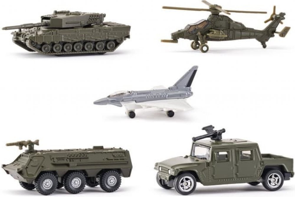 Sada vojenských vozidel SIKU Military. Sada obsahuje 5 různých modelů, které jsou věrnou replikou vojenských vozidel. Modely se vyznačují realistickými detaily a jsou vyrobeny z tlakově litých kovových a plastových komponentů. Modely SIKU neobsahují žádné PVC a splňují mezinárodní bezpečnostní normy pro hračky.