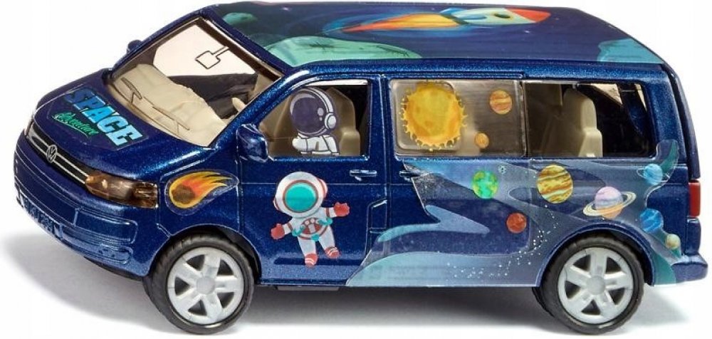 S vlastní sadou „Style my siku“ se T5 nyní nejen dostane na vzdálený konec světa, ale dokonce ještě za něj. Nebo přesněji do vesmíru! Všechny dodávané nálepky jsou založeny na tématu „astronaut“, takže přeměňují tmavě modrého vesmírného univerzála na skutečné meziplanetární vozidlo. Zdobený měsícem, planetami, raketoplánem a astronauty plovoucími vesmírem umožňuje svému majiteli doslova sahat ke hvězdám. Model vozidla s kovovou karoserií a pogumovanými pneumatikami je dodáván v samostatných částech pro snadnou montáž a zadní víko lze otevřít.