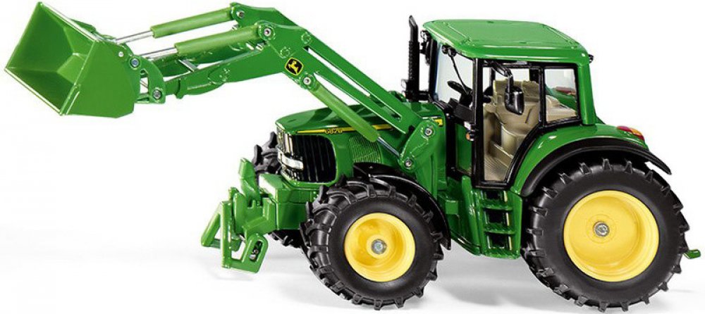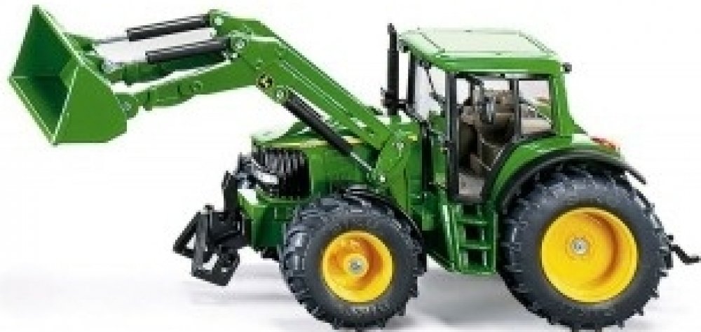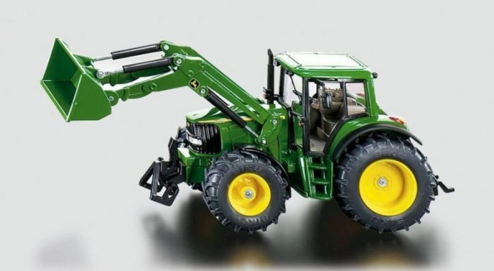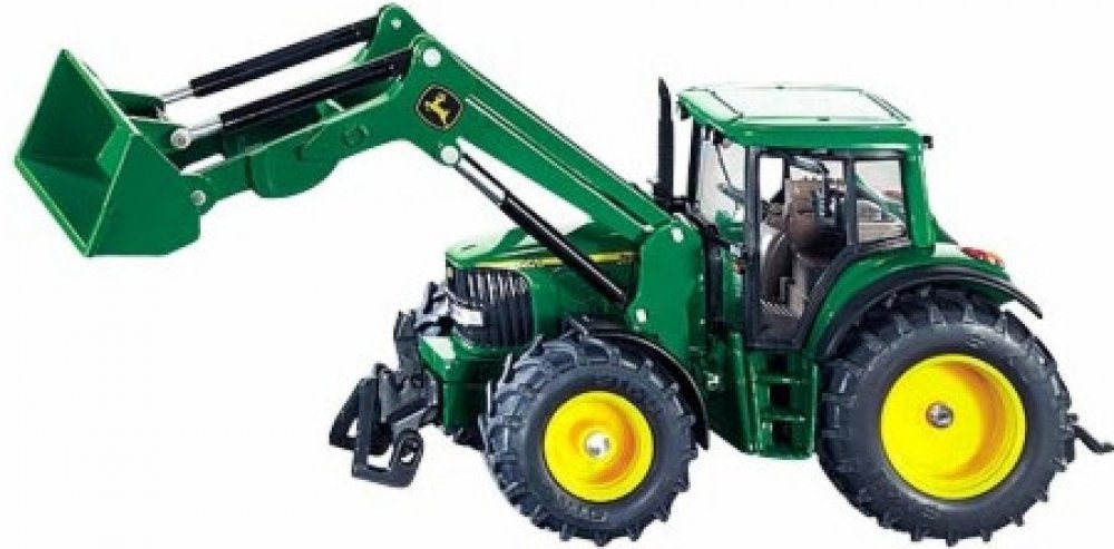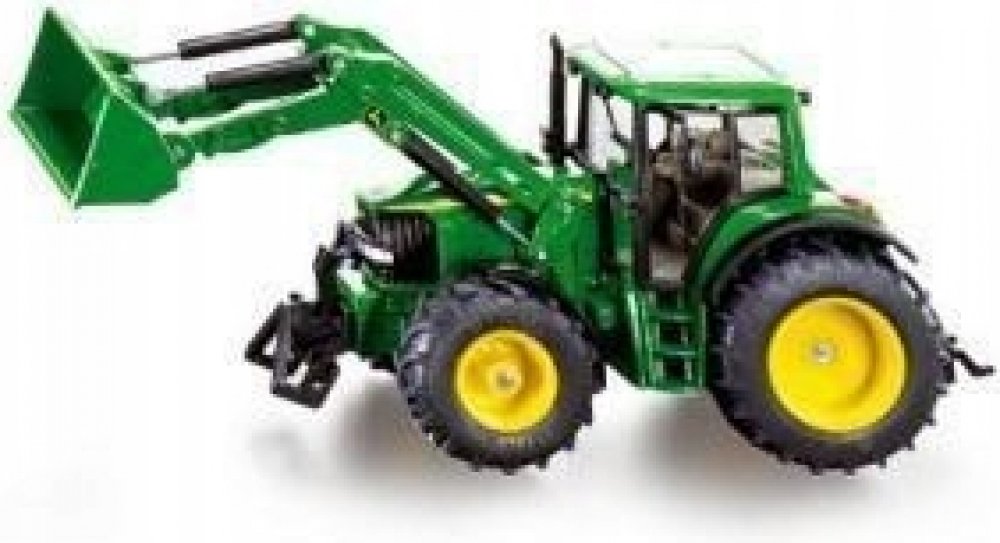Kovový model traktoru John Deere v měřítku 1:32. S předním pohyblivým nakladačem a lžící, zatáčením předních kol pomocí volantu a kabinou se sklopnými zrcátky, kterou lze oddělat. Přední držák a tažné zařízení. Vhodné pro hraní i sběratelství. Kvalitní autentické zpracování z kovu a plastu.