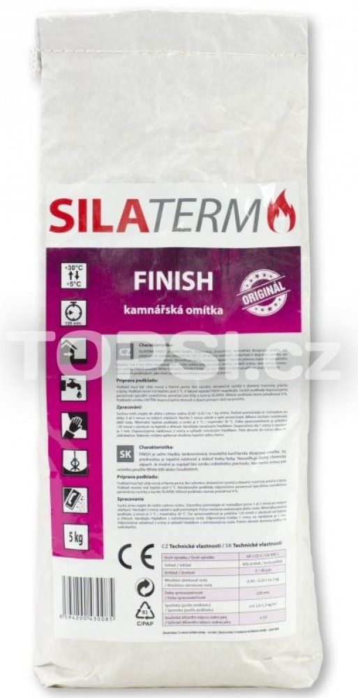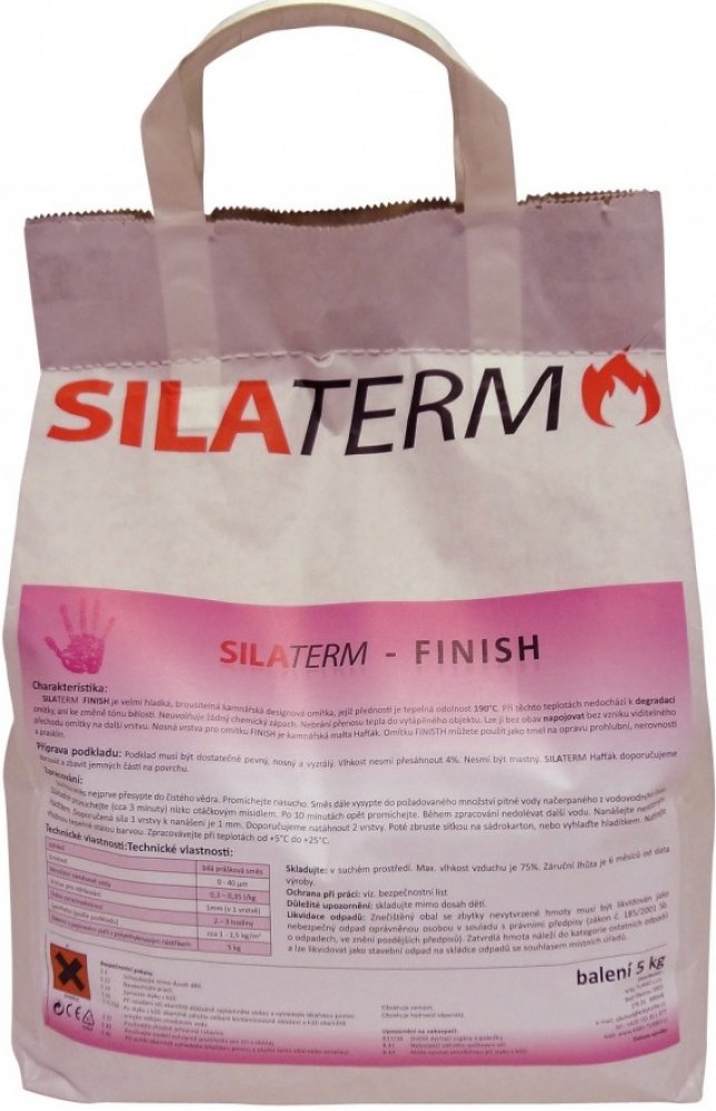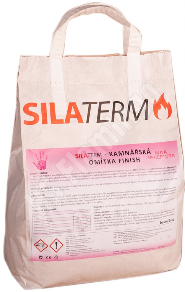 Silaterm FINISH je kamnářská omítka vhodná pro finální dekorativní omítku krbu. Velmi hladká, brousitelná omítka. Má teplotní odolnost až 190 °C. Ani při těchto teplotách nedochází k degradaci omítky, či ke změně tónu bělosti. Neuvolňuje žádný chemický zápach a nebrání přenosu tepla do vytápěného prostoru. Lze ji napojovat bez vzniku viditelného přechodu, což velmi usnadňuje postupné nanášení a případné opravy. Nanáší se na základní omítku vytvořenou kamnářskými maltami Silaterm WHITE 600 nebo Silaterm Hafťák, kterou je potřeba penetrovat k tomu určeným penetračním přípravkem Silaterm SILAPEN s teplotní odolností 600 °C. Lze ji použít i jako tmel na opravu prohlubní, nerovností a prasklin. Povrch je po zbroušení jemnou brusnou mřížkou na sádrokarton naprosto hladký a sněhově bílý. Spotřeba je dle podkladu cca 1–1,5 kg/m2. K dispozici je v pytlích 5 kg a 16 kg. Příprava podkladu: podklad musí být pevný a nosný, vyzrálý, zbaven prachu, mastnoty a jiných nečistot podklad nesmí přesáhnout vlhkost 4 % podklad musí být napenetrován, penetrace dokonale zaschlá je doporučeno před nanášením podkladovou omítku broušením zbavit jemných částic na povrchu Příprava a zpracování: Suchou směs nejdříve přesypte do suchého vědra a promíchejte nasucho. Potom směs vysypte do předepsaného množství pitné vody a důkladně promíchejte nízkootáčkovým míchadlem. Po 10 minutách opět promíchejte. Během zpracování nedolévejte další vodu. Nanášejte nerezovým hladítkem. Doporučená tloušťka jedné vrstvy je 1 mm (výrobce doporučuje natáhnout 2 vrstvy). Poté zbruste síťkou na sádrokarton. Zpracovávejte při teplotě +5 °C až +25 °C. Natírejte vhodnou teplotně stálou barvou.