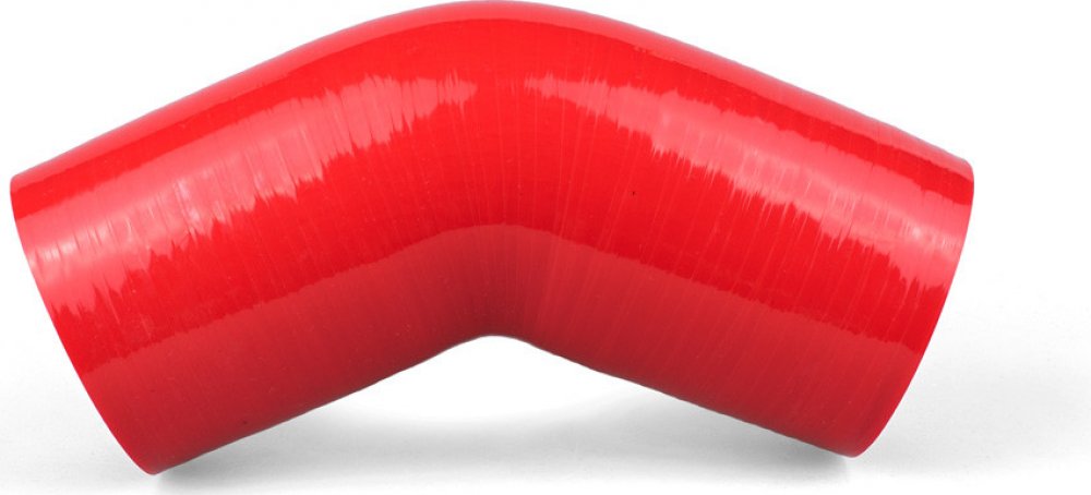 Silikonové koleno 45 stupňů pro tlakové vedení vzduchu s vnitřním průměrem 63 mm, tloušťkou stěny 5 mm a 4-vrstvým zesílením tkaninou. Technické parametry: Vnitřní průměr: 63 mm Úhel zahnutí kolena: 45 stupňů Tloušťka stěny: 5 mm Teplotní odolnost: -40°C až 180°C Maximální tlak: 5 bar Barva: červená, černá Tyto kvalitní hadice jsou ideální pro sestavení tlakového vedení vzduchu k intercooleru či turbodmychadlu, pro sestavení sacího vedení k airboxu nebo filtru nebo pro vedení vody v chladicí soustavě.