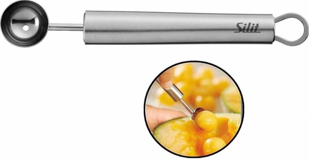Vaření by bylo mnohem složitější bez praktického kuchyňského náčiní. Silit Classic Line Vykrajovač kuliček je vyroben z lesklé ušlechtilé oceli 18/10 a umožňuje pohodlné vykrajování kuliček z jablek, melounů, brambor nebo dýní. Navíc je vhodný i pro odstraňování jadér. Díky úzké ergonomické rukojeti je vysoce komfortní a bezpečné ho držet při přípravě jídel. Očko na rukojeti umožňuje jednoduché uložení na závěsnou lištu a nástroj lze také pohodlně umýt v myčce nádobí. Rozměry vykrajovače jsou průměr 2,5 cm a délka 16 cm.