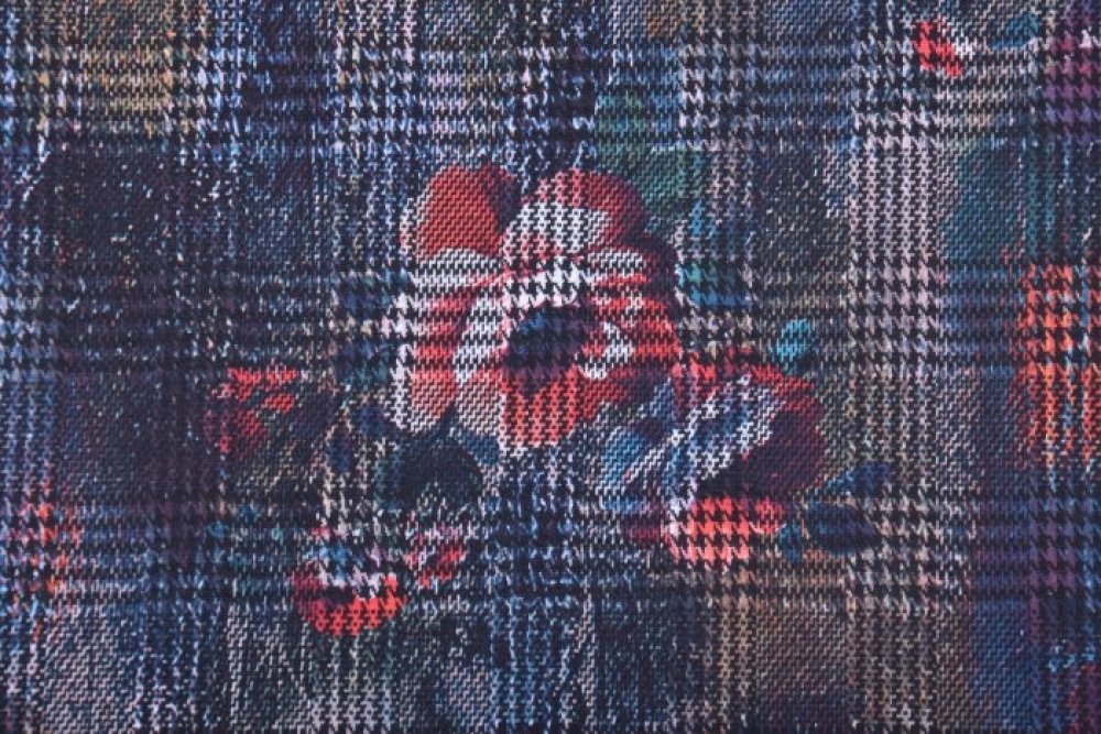 Silnější úplet ve složení polyester, viskóza a lycra s potiskem květin v červené barvě a kostky v barvě černé je příjemným, hladkým materiálem, který je pružný díky pleteninové vazbě úpletu. Silnější úplet je vhodný na podzimní a zimní oblečení, které lze využít na sukěn, šaty, trika, topy, tuniky.