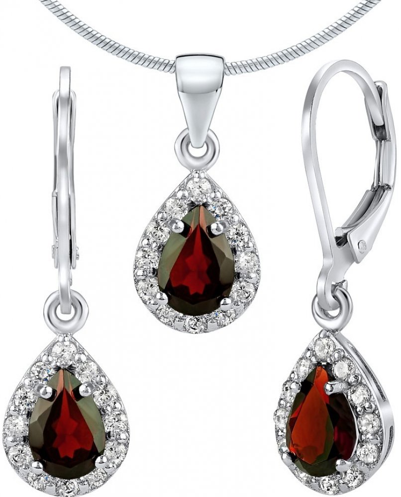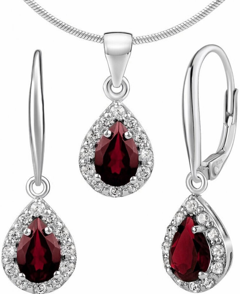 Dárková souprava stříbrných šperků EUREKA s pravým Granátem - náušnice a přívěsek. Kámen: přírodní pravý Granát. Velikost náušnic včetně zapínání: 27 mm. Velikost kapky: 11 x 8 mm. Velikost kamene: 7,5 x 5 mm. Přívěsek: 18 mm včetně poutka. Vnitřní rozměr poutka pro přívěsky: 4 x 2,5 mm. Materiál: Stříbro ryzost 925/1000 Povrchová úprava: Leštěný povrch. Rhodiovaný povrch - vysoký lesk, vzhled bílého zlata, šperk je odolný vůči oxidaci (nečerná) a je hypoalergenní (mohou ho nosit i lidé s alergií na stříbro). Řetízek není součástí, doporučujeme přikoupit stříbrný řetízek. Součástí je certifikát pravosti kamene. - 3.5 g, Stříbro 925/1000
