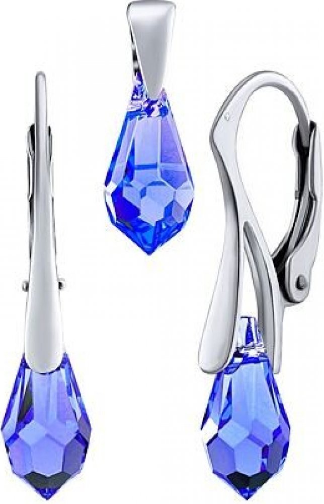 Stříbrný set přívěsku a náušnic Jessie ve tvaru kapky Swarovski® Crystals v tmavě modré barvě Saphire Blue. Něžné náušnice a přívěsek. Oblíbený jemný tvar menší kapky a výjimečný třpyt jistě ozdobí Vaši tvář a krk. Materiál: Stříbro ryzost 925/1000. Velikost náušnic celkem : 25 x 5 mm. Výška kamene: 11 mm. Velikost přívěsku: 15 mm. Výška kamene: 11 mm. Povrchová úprava: rhodiovaný povrch – vysoký lesk, vzhled bílého zlata, šperk je odolný vůči oxidaci (nečerná) a je hypoalergenní (mohou ho nosit i lidé s alergií na stříbro). Cena je za celý set složený z náušnic a přívěsku. - 2,4 g, Stříbro 925/1000