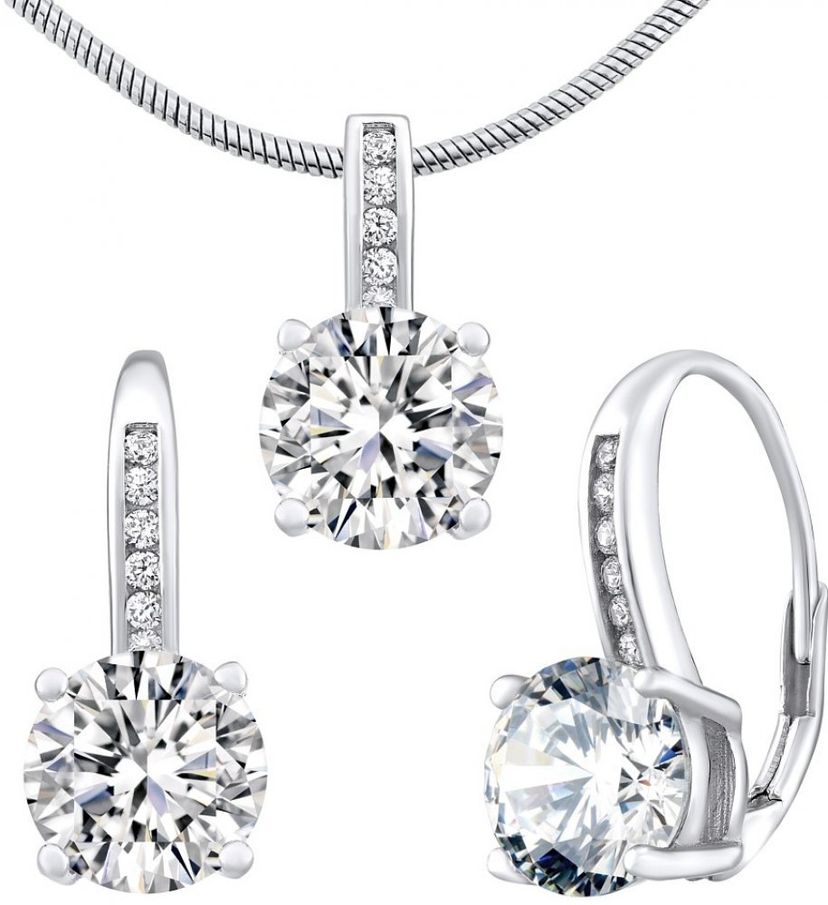 Dámská souprava tvořena náušnicemi a přívěskem, ke kterému doporučujeme přikoupit řetízek. Vnitřní velikost očka 3,5 x 2 mm. Náušnice se zapínáním na dámský patent. Sada je zdobena větším zirkonem velikosti 8 mm čiré barvy a drobnými zirkonky stejné průzračnosti usazenými v horní části. Šperk s luxusním vzhledem má navíc povrchovou úpravu rhodium dodávající lesk a vzhled bílého zlata. Tím celou krásu stříbra podtrhuje.