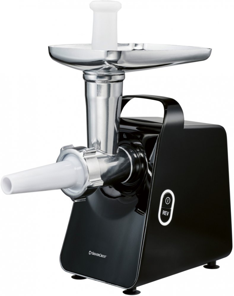 Silvercrest® Elektrický mlýnek na maso Vlastnosti Nástavec na pasírování rajčat Všestranné použití – ideální na mletí masa a výrobu klobás Vhodný i na křehké sušenky - včetně nástavce na sušenky z nerezové oceli* se 4 motivy Vypínač a funkce zpětného chodu Plnicí miska, vtoková/výtoková hubice a podávací šnek jsou z tlakově litého hliníku: lze je demontovat na podávací šnek; křížový nůž a pojistný...