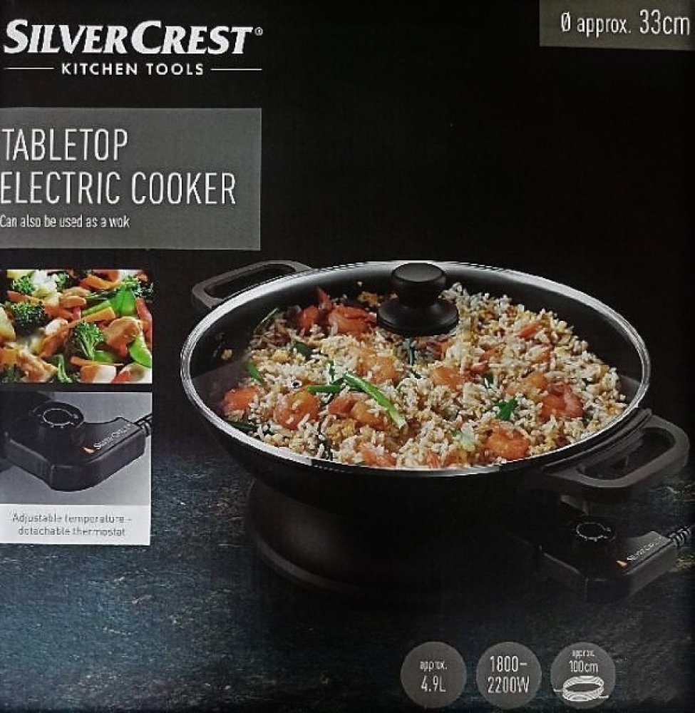 Silvercrest Elektrická multifunkční pánev Semp 2000 A1, Ø 33 cm Lze použít také jako pánev wok Plynulé nastavení teploty s odnímatelným termostatem Multifunkční pánev s nepřilnavou povrchovou úpravou Tepelně odolná skleněná poklice s parním ventilem a okrajem z nerezové oceli Protiskluzové patky pro stabilní polohu Ochrana proti přehřátí Objem: cca 4,9 l Odolné při teplotě od cca 135 °C do 240 °C Technické údaje Příkon: 1800 - 2200 W Napětí: 220-240 V, 50-60 Hz Délka kabelu: cca 1 m Materiál Hliník; sklo, umělá hmota, silikon Rozměry Pánev: cca Ø 33 x 9 cm Poklice: cca Ø 32,5 x 4 cm Hloubka pánve: cca 9 cm Hmotnost cca 2,972 kg