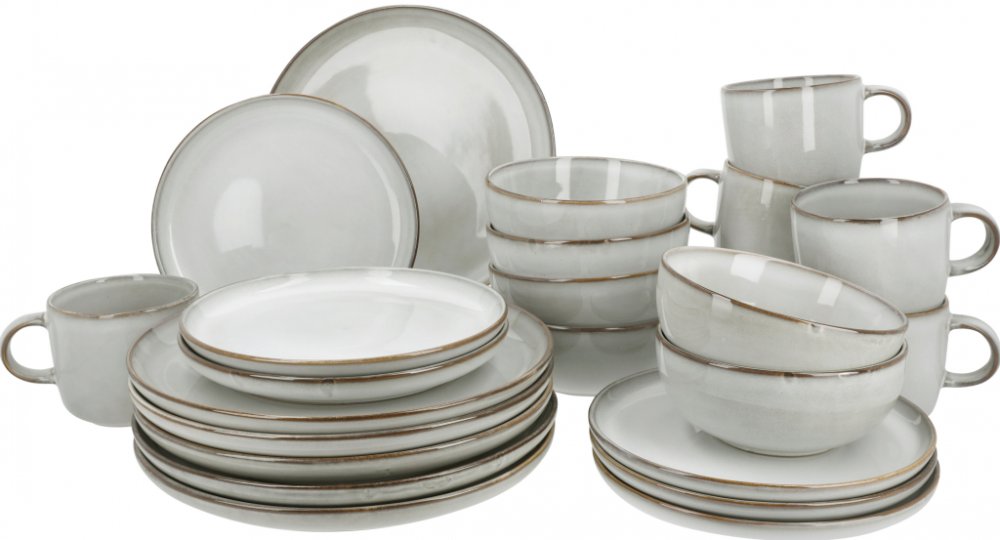 Silvercrest® Jídelní servis, 24dílná sada Jídelní servis Silvercrest® v sobě dokonale spojuje funkčnost a estetiku. Každý kus v této sadě je jedinečný; vyrobený z vysoce kvalitní kameniny. Ať už pro každodenní použití nebo pro zvláštní příležitosti; tato sada je vhodná do myčky na nádobí a mikrovlnné trouby, a tedy nenáročná na údržbu. Nechte se inspirovat individuálním designem a užijte si stylové stolování s rodinou a přáteli. Vlastnosti Kvalitní kamenina Individuální vzhled – každý kus je jedinečný Vhodný do myčky na nádobí a mikrovlnné trouby ;} Charakteristika produktu Vhodný do myčky nádobí: ano Vhodný do mikrovlnné trouby: ano Materiál: kamenina Počet kusů: 24 Obsah balení: 6x talíř (Ø 24,9 cm) 6x dezertní talíř (Ø 19,2 cm) 6x miska (cca 390 ml) 6x šálek (cca 315 ml)