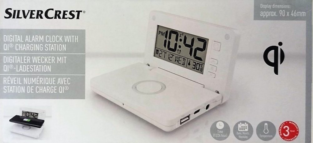 SILVERCREST® Digitální budík s nabíjecí stanicí Qi® Na bezkabelové nabíjení spotřebičů podporujících Qi® technologii LC displej se 3 stupni jasu a bílým osvětlením pozadí Zobrazení času, data, dne v týdnu a teploty Alarm s opakováním Ukazatel dne týdne nastavitelný v 7 jazycích Včetně síťového adaptéru a baterie (1x 3 V, CR2032, pro back up nastavení) Technické údaje Bezdrátový výkon (Qi®): až 10 ...