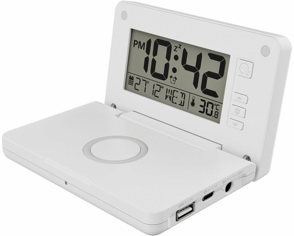SILVERCREST® Digitální budík s nabíjecí stanicí Qi® Na bezkabelové nabíjení spotřebičů podporujících Qi® technologii LC displej se 3 stupni jasu a bílým osvětlením pozadí Zobrazení času, data, dne v týdnu a teploty Alarm s opakováním Ukazatel dne týdne nastavitelný v 7 jazycích Včetně síťového adaptéru a baterie (1x 3 V, CR2032, pro back up nastavení) Technické údaje Bezdrátový výkon (Qi®): až 10 W Vstup: 9 V / 2,5 A (pro dodaný síťový adaptér) nebo 22,5 W USB nabíječka (není součástí) / výstup: 10 W Výstup USB typ A: 5 V / 1 A pro nabíjení mobilních telefonů, tabletů nebo přehrávačů MP3 při používání síťového adaptéru nebo USB nabíječky 22,5 W (není součástí) Stupeň účinnosti přeměny: >70 % Materiál Plast Rozměry Přístroj: cca 14 x 11 x 9,3 cm Displej: cca 9 x 4,6 cm Hmotnost cca 230 g