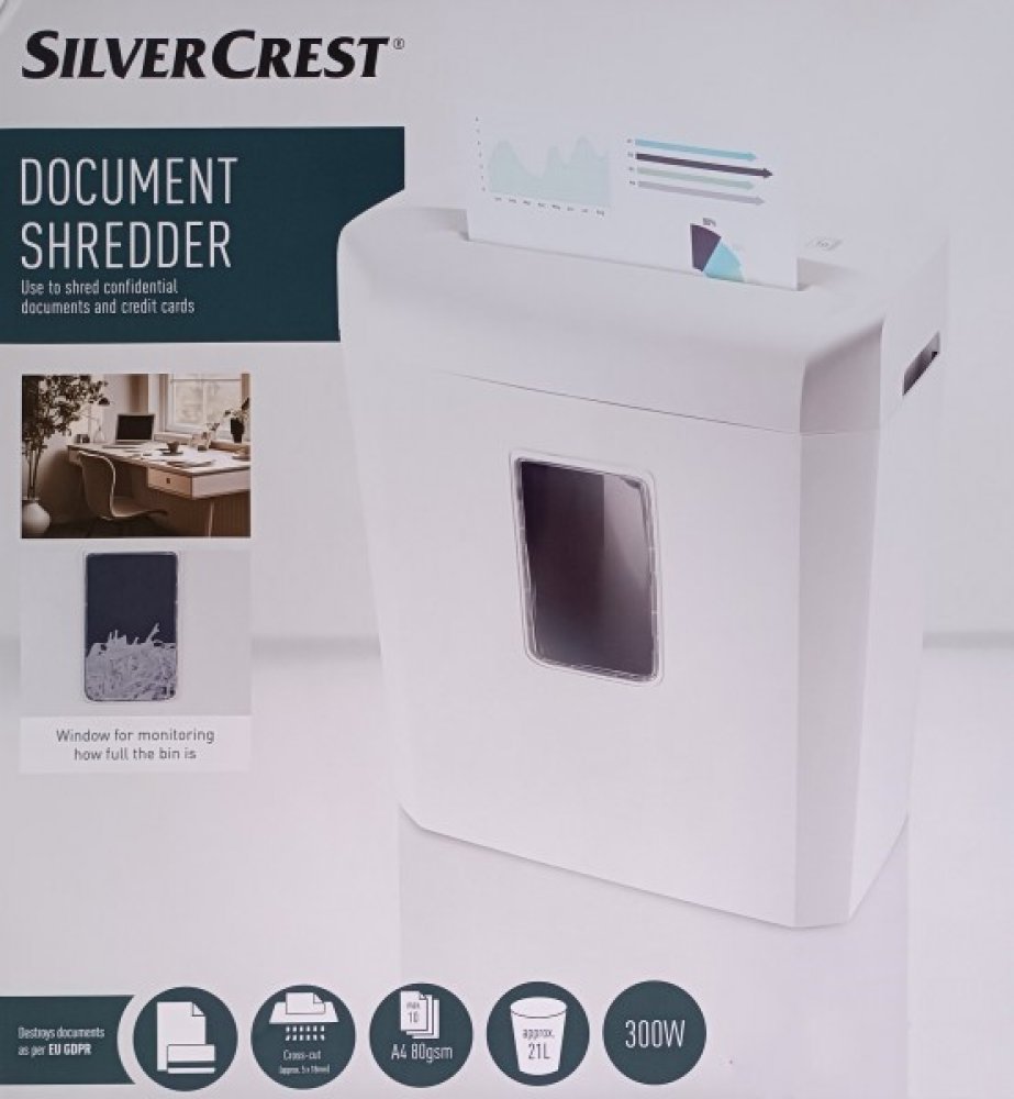 Silvercrest® Skartovačka SAV 300 A2 / TAV 300 A2 Mimořádně malý křížový řez pro vyšší bezpečnost (velikost částic cca 5 x 18 mm) I Na likvidaci důvěrných dokumentů a kreditních karet Zpracuje až 10 listů (A4, 80 g/m²) včetně malých sponek Včetně zásobníku na papír: cca 21 l Včetně mazacího papíru pro údržbu řezacího mechanismu Automatická funkce start/stop se zpěným chodem v případě uvíznutí papíru Bezpečnostní vypnutí při vyjmutí řezací jednotky a při přehřátí Postranní prohlubně na uchopení Kontrola stavu obsahu přes průhledné okénko Červená výstražná LED kontrolka signalizující přehřátí Příkon: 300 W Délka síťového kabelu: cca 1,5 m Na likvidaci dokumentů v souladu s Gdpr I Pro srovnání: bezpečnostní stupeň P-4 podle DIN 66399 pro zvláště důvěrné dokumenty je již splněn při velikosti částic 4 x 40 mm (160 mm²) Charakteristika produktu ;} Řezná kapacita: až 10 listů Velikost řezu: 5 x 18 mm Materiál: Skříň motoru: ABS Kontejner: PP, Hips Nůž: ocel Rozměry: cca 35 x 20,5 x 42 cm Hmotnost: cca 4,5 kg Obsah balení: Skartovačka včetně zásobníku na papír cca 21 l, mazací papír pro údržbu řezacího mechanismu