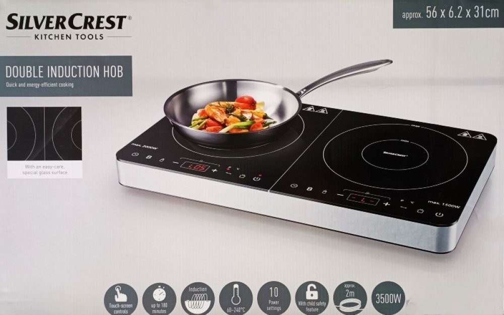Silvercrest ® Kitchen Tools Dvojitá indukční varná deska SDI 3500 E1 Rychlé a energeticky úsporné vaření Nenáročný; speciální skleněný povrch Vhodná pro indukční nádobí s průměrem dna od 10 do 22 cm Dotykový senzorový ovládací panel s 8 tlačítky a LED displejem pro snadné ovládání každé varné desky Teplotní stupně nastavitelné v krocích po 10 °C až do max. 240 °C Integrované rozpoznání hrnce – varovný signál a bezpečnostní vypínání Časovač na 180 minut Ochrana proti přehřátí a přepětí Dětská pojistka Technické údaje Výkonnostní stupně: Levá varná deska: 10 stupňů výkonu od 200–2 000 W Pravá varná deska: 7 stupňů výkonu od 200–1 500 W Teplotní rozsah: 60–240 °C Délka síťového kabelu: cca 2 m Příkon: 3 500 W Rozměry cca 56 x 6,2 x 31 cm (Š x V x H) Hmotnost cca 4,6 kg