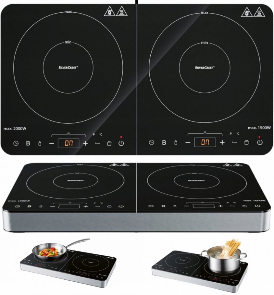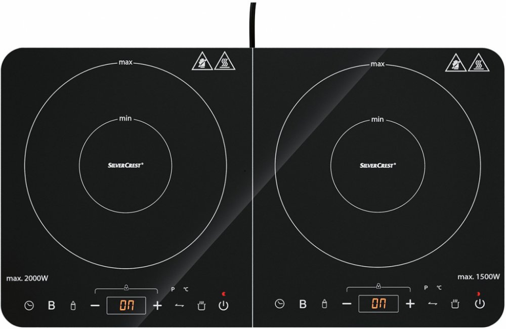 Silvercrest ® Kitchen Tools Dvojitá indukční varná deska SDI 3500 E1 Rychlé a energeticky úsporné vaření Nenáročný; speciální skleněný povrch Vhodná pro indukční nádobí s průměrem dna od 10 do 22 cm Dotykový senzorový ovládací panel s 8 tlačítky a LED displejem pro snadné ovládání každé varné desky Teplotní stupně nastavitelné v krocích po 10 °C až do max. 240 °C Integrované rozpoznání hrnce – var...