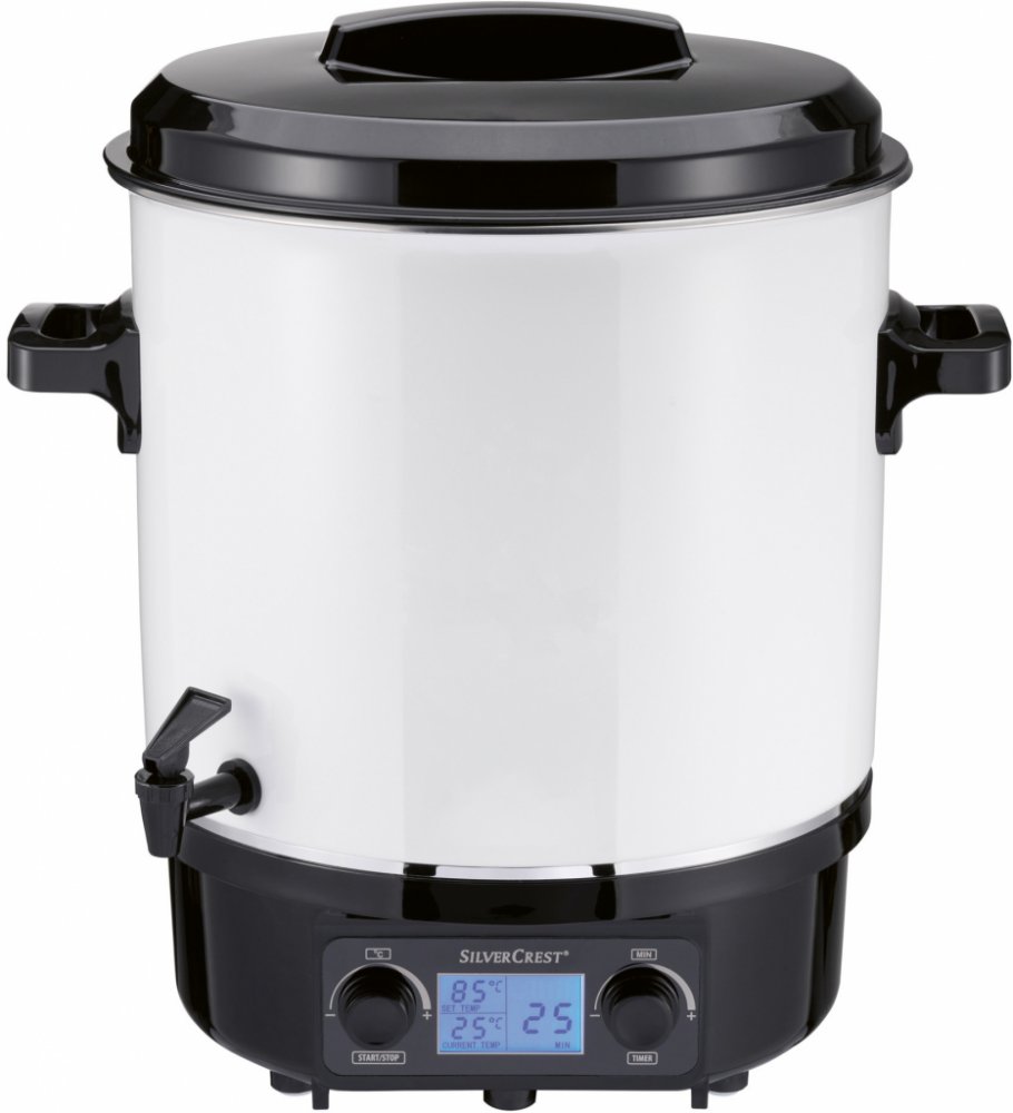 Silvercrest® Kitchen Tools Zavařovací hrnec Sead 1800 B1 Zavařování a konzervování marmelády; ovoce a zeleniny Vhodný i na ohřívání a udržování teploty nápojů nebo polévek Digitální displej a elektronické ovládání Vhodný až na 14 zavařovacích sklenic ve dvou vrstvách – včetně roštu Smaltovaný korpus a tepelně izolované úchyty Integrovaný kohoutek, např. na punč Nádoba s velkým objemem (cca 27 l) V...