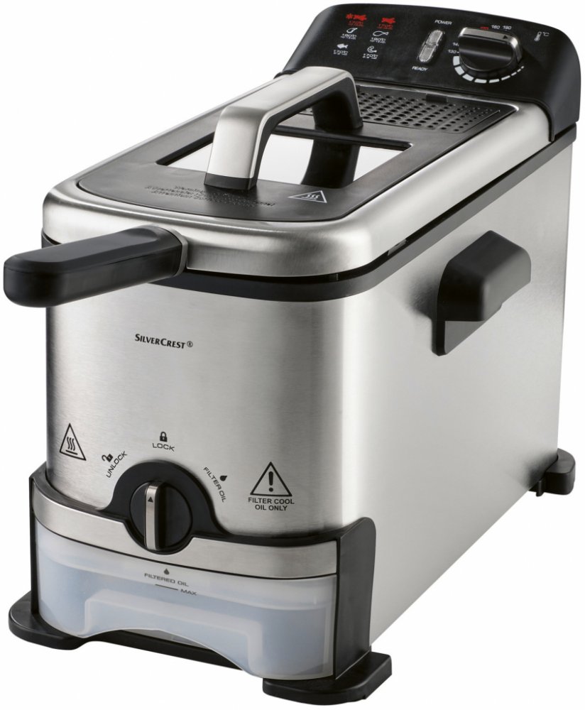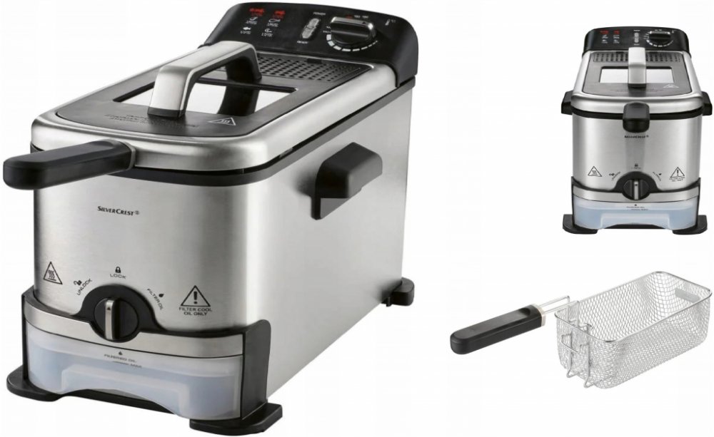 Silvercrest® Kitchen Tools Fritéza z nerezové oceli s funkcí čištění oleje SFO 2000 A1, 2,1L, 2 000 W Funkce čištění oleje Fritovací koš lze zavěsit Fritovací nádoba s integrovaným filtračním sítem Včetně praktické přihrádky na kabel Otočný regulátor pro otevírání a zavírání výpusti oleje Plynule nastavitelný termostat až do 190 °C 2 světelné kontrolky pro provoz (modrá) a teplotu (zelená) Ochrana proti přehřátí a ochrana proti provozu na sucho Protiskluzové nožky pro stabilní polohu Technické údaje Příkon: 2 000 W Objem: Fritovací koš: cca 1,4 l na cca 600 g hranolků Nádoba na olej: cca 3 l Fritovací nádoba: cca 2,7 l Rozměry Délka síťového kabelu: cca 100 cm cca 25 x 30,8 x 57,5 cm (Š x V x H) Fritovací koš včetně rukojeti: 13,5 x 14,7 x 46,5 cm (Š x V x H) Hmotnost cca 3,9 kg
