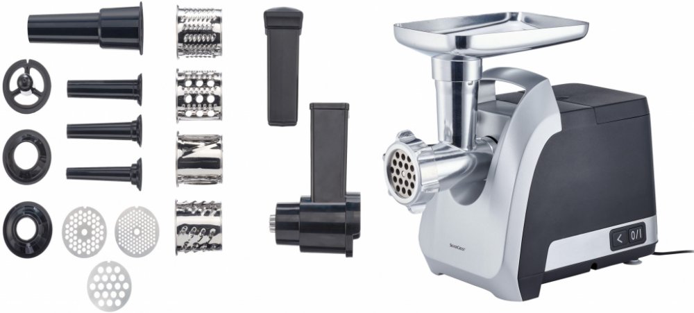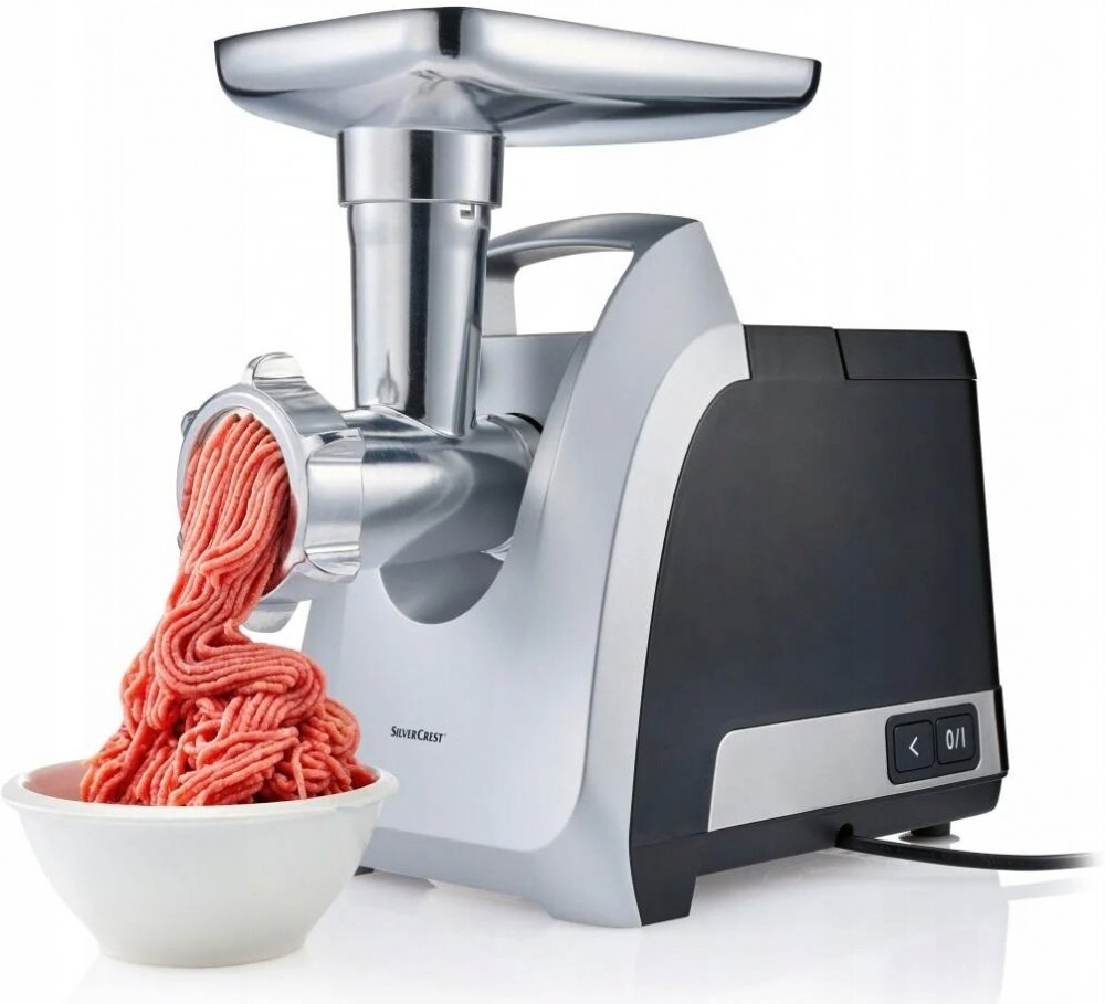 Silvercrest® Kitchen Tools Elektrický mlýnek na maso SFW 800 A1 Včetně rozsáhlého příslušenství Všestranný – ideální pro mletí např. masa, ryb, zeleniny, stejně jako pro výrobu klobás Rovnoměrné a rychlé zpracování potravin díky vysokému výkonu motoru a blokování Ovládací panel s vypínačem a zpětným chodem Hygienické a pohodlné čištění díky možnosti rozebrání na jednotlivé díly Včetně praktického navijáku kabelu Nožičky s přísavkami pro dobrou stabilitu Integrovaná přihrádka na disky Krátkodobý provoz: 15 minut Tepelný vypínač na ochranu proti přehřátí Zpracuje cca 3 kg masa/min (v závislosti na směsi a druhu masa) Příslušenství: 3 perforované kotouče (3 mm, 5 mm, 8 mm) Nástavec na krájení zeleniny se čtyřmi různými vložkami Nástavec na klobásy s kroužkem Nástavec na kebbe s kroužkem Plnicí mísa s výlevkou Plnicí box Technické údaje Blokovací výkon motoru: 2 200 W Příkon: 800 W Provozní napětí: 220–240 V, 50/60 Hz Rozměry Délka kabelu: cca 1 m Zařízení: cca 18 x 25,4 x 26,8 cm (Š x V x H) Hmotnost Mlýnek na maso (bez příslušenství): 2 995 g
