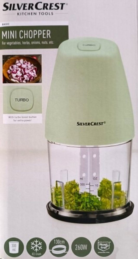 Silvercrest® Kitchen Tools Univerzální drtič SMZ 260 J4 Sekání zeleniny, bylinek, koření; ořechů atd. Tlačítko turbo pro maximální výkon Včetně emulgačního kotouče na šlehání smetany Vhodný na drcení ledu Jednoduché ovládání jednou rukou Vyjímatelné nožové ústrojí z nerezové oceli pro jednoduché čištění Odnímatelný podstavec – použitelný také jako víko 2 čepele Využitelný objem: až cca 300 ml Tech...