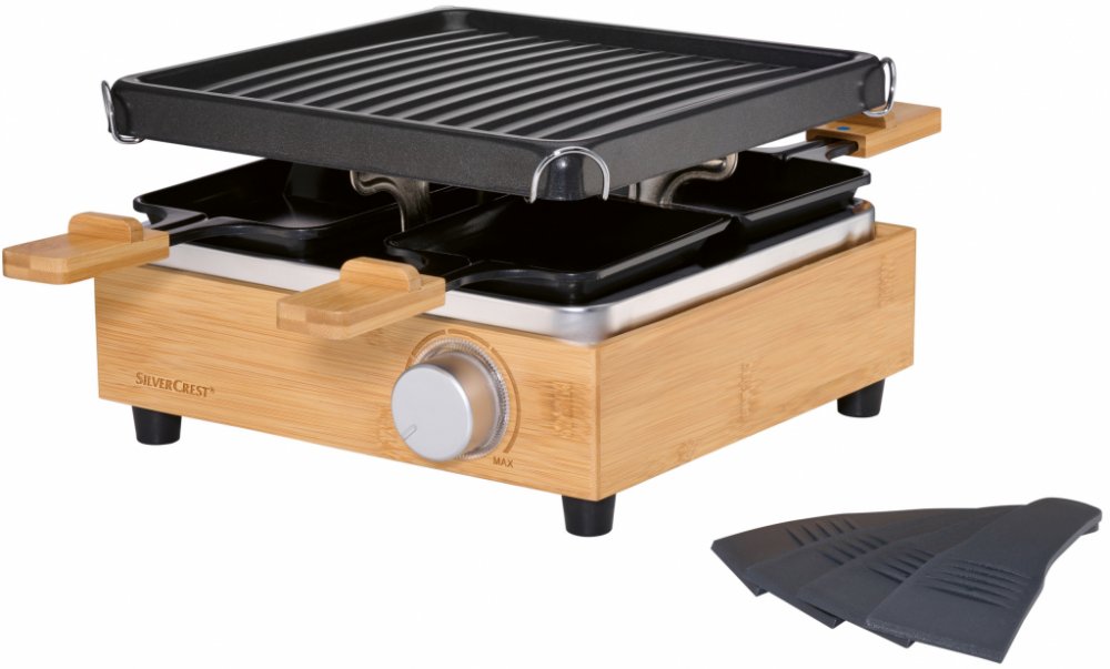 Silvercrest® Raclette gril s bambusovým povrchem Srgb 800 A1 Vlastnosti Pro 4 osoby Na gratinování a grilování zeleniny, masa a ryb Odnímatelná grilovací deska s hliníkovou povrchovou úpravou a vysoce kvalitním nepřilnavým povrchem Ilag ® Všestranný systém na bázi vody Dobré nepřilnavé vlastnosti Plynule nastavitelný termostat Topné těleso a tepelný reflektor z nerezové oceli Protiskluzové nožky p...